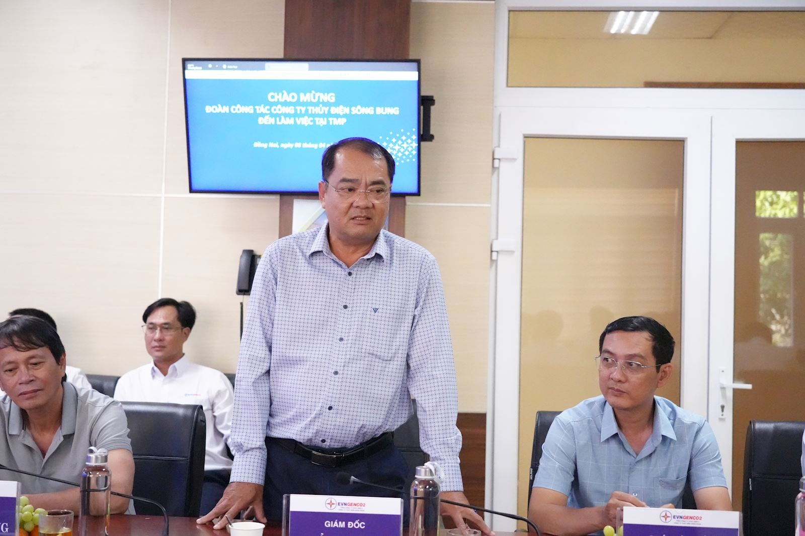Ông Huỳnh Văn Khánh – Chủ tịch Công ty Cổ phần Thủy điện Thác Mơ (áo xanh, thứ hai từ trái sang, đang vỗ tay) cùng lãnh đạo Công ty tại buổi làm việc với Đoàn công tác.
