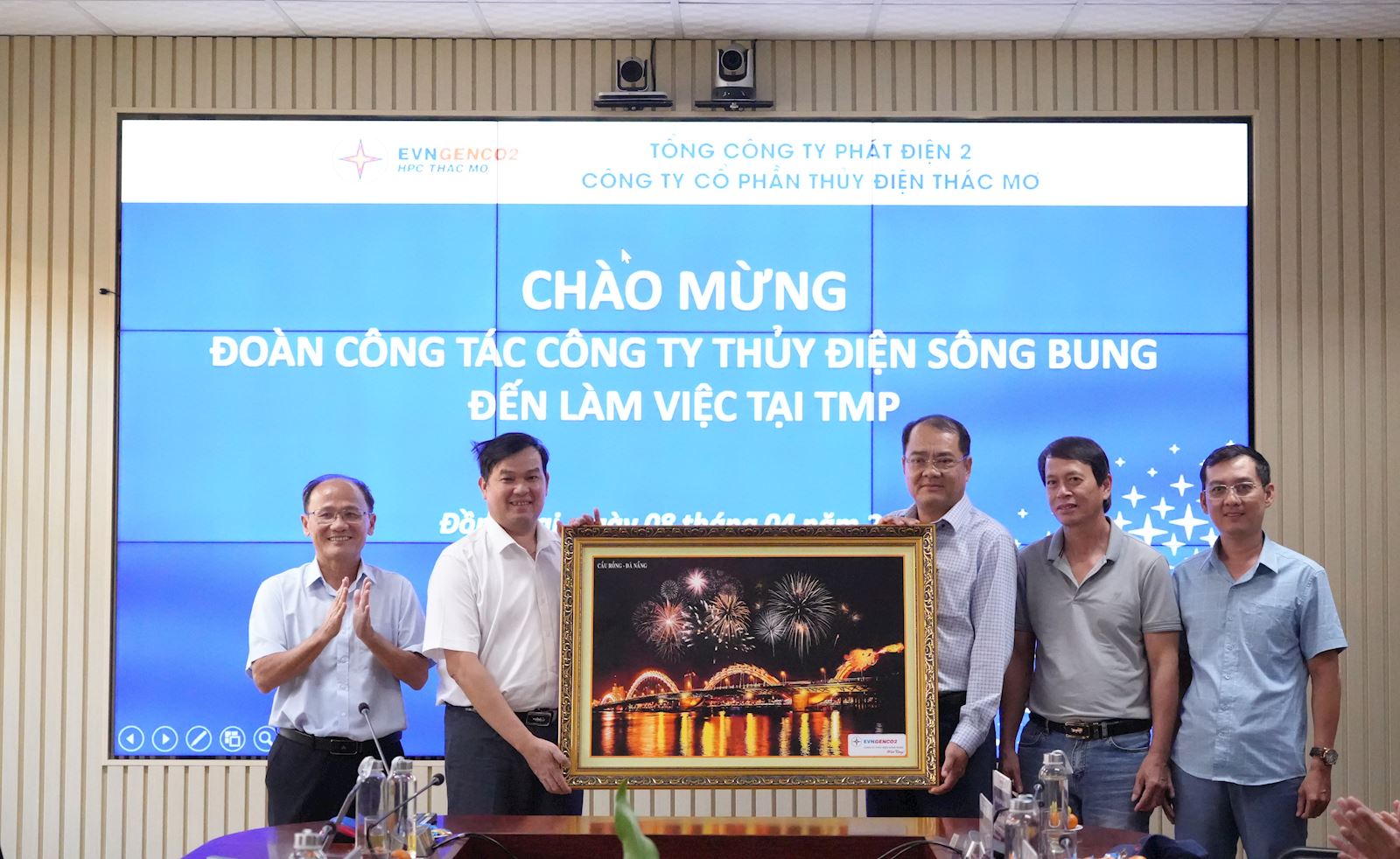 Lãnh đạo Công ty Thủy điện Sông Bung trao tặng tranh lưu niệm tới lãnh đạo Công ty Cổ phần Thủy điện Thác Mơ nhân chuyến thăm và làm việc của Đoàn công tác.