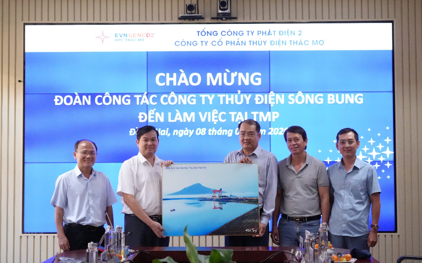 Lãnh đạo Công ty Cổ phần Thủy điện Thác Mơ trao tặng tranh lưu niệm tới lãnh đạo Công ty Thủy điện Sông Bung nhân chuyến thăm và làm việc của Đoàn công tác.
