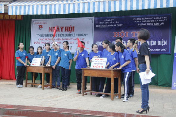 Học sinh Trường THCS Tân Lợi (TP. Buôn Ma Thuột) hào hứng tham gia hội thi “Học sinh với kiến thức tiết kiệm điện”.