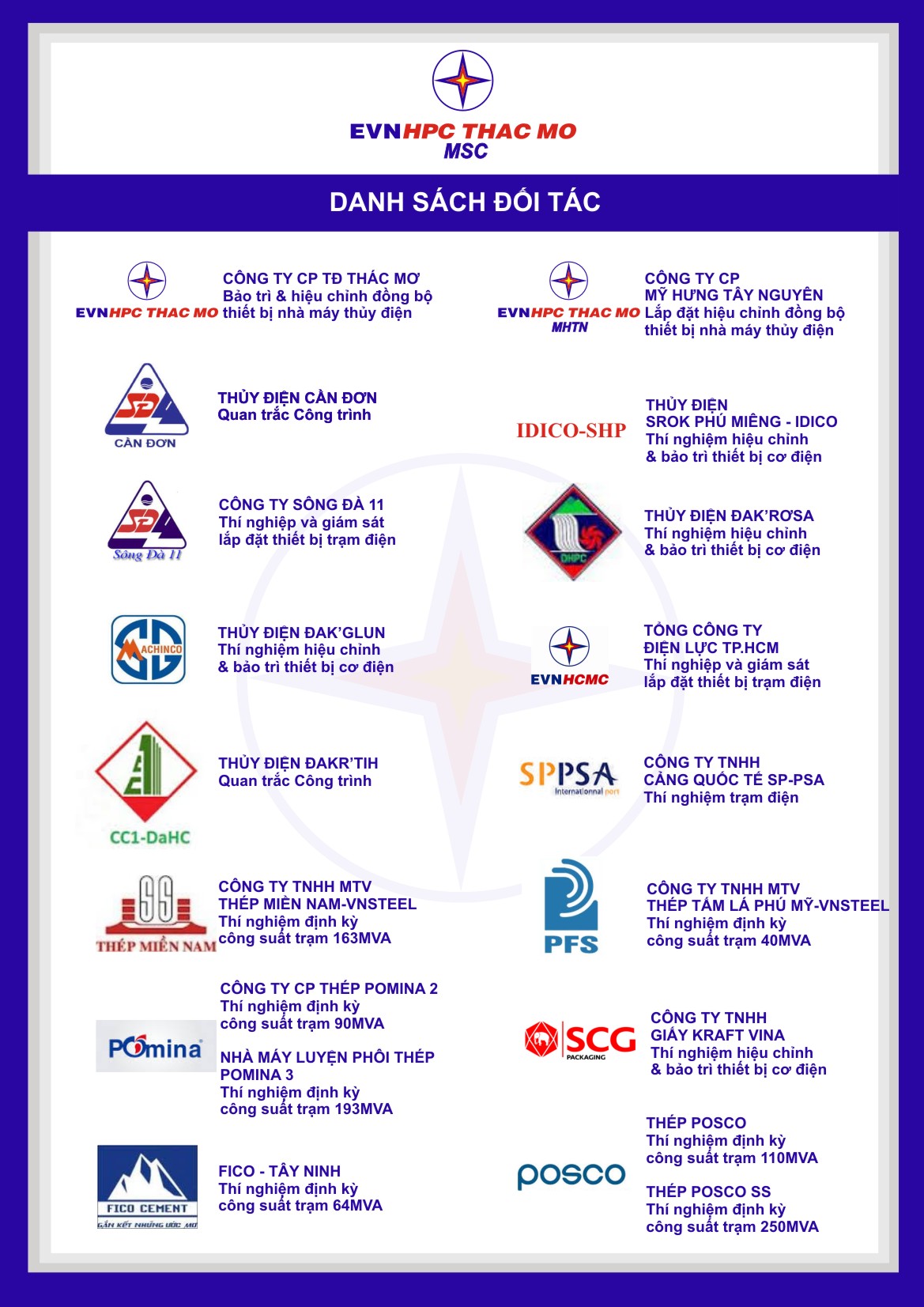 Trung tâm Dịch vụ và Sửa chữa cơ điện (MSC) được chính thức thành lập từ tháng 9/2010, nòng cốt của TTDV&SCCĐ hiện nay là đội ngũ CBCNV của các Phân xưởng sửa chữa thuộc Công ty Cổ phần thủy điên Thác Mơ. Với kinh nghiệm tích lũy và trình độ kỹ thuật cao của đội ngũ Kỹ sư thuộc Trung tâm Dịch vụ & Sửa chữa cơ điện, bên cạnh nhiệm vụ chính là bảo dưỡng sửa chữa tổ máy và thiết bị thuộc các nhà máy điện trong Công ty quản lý.