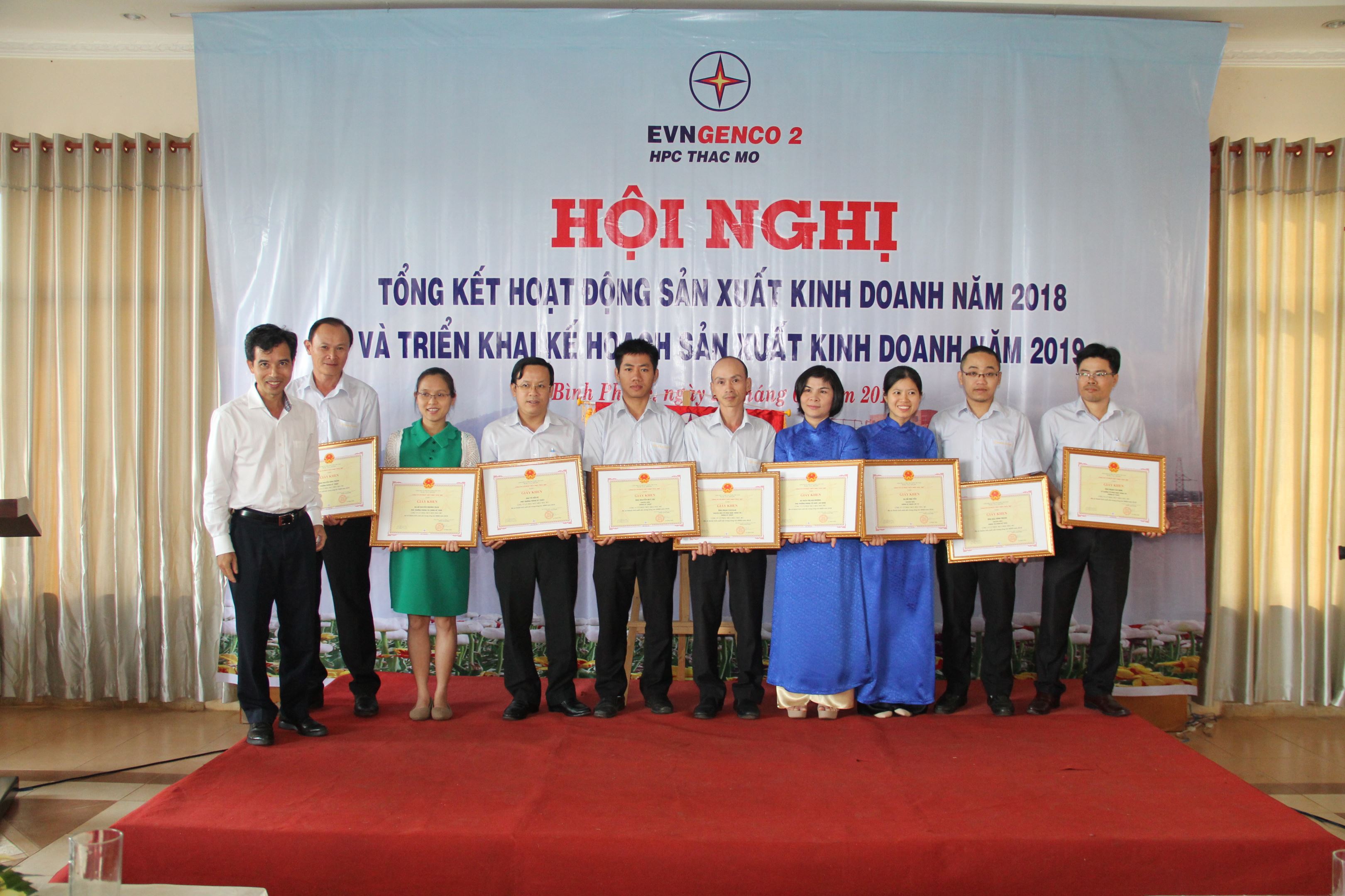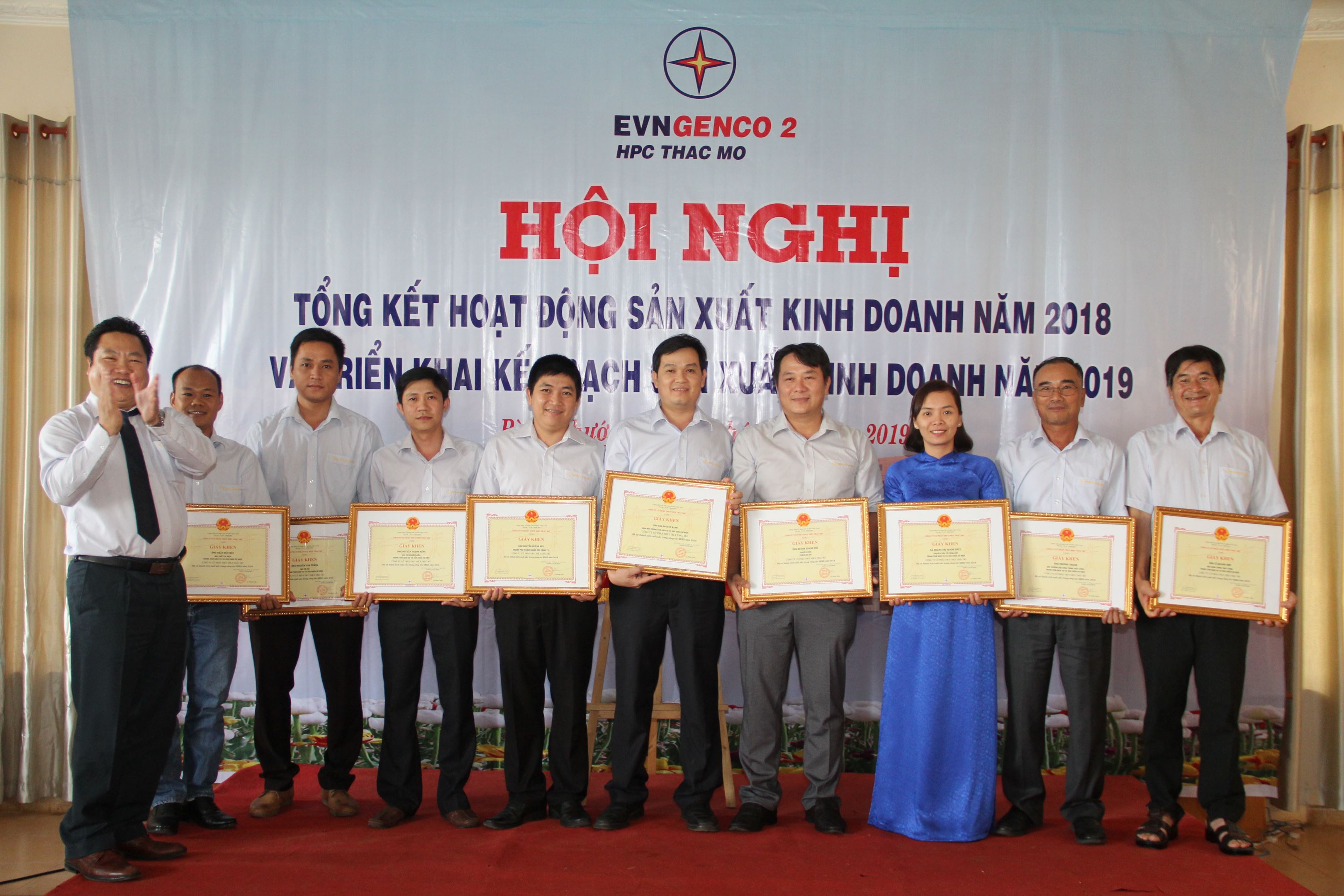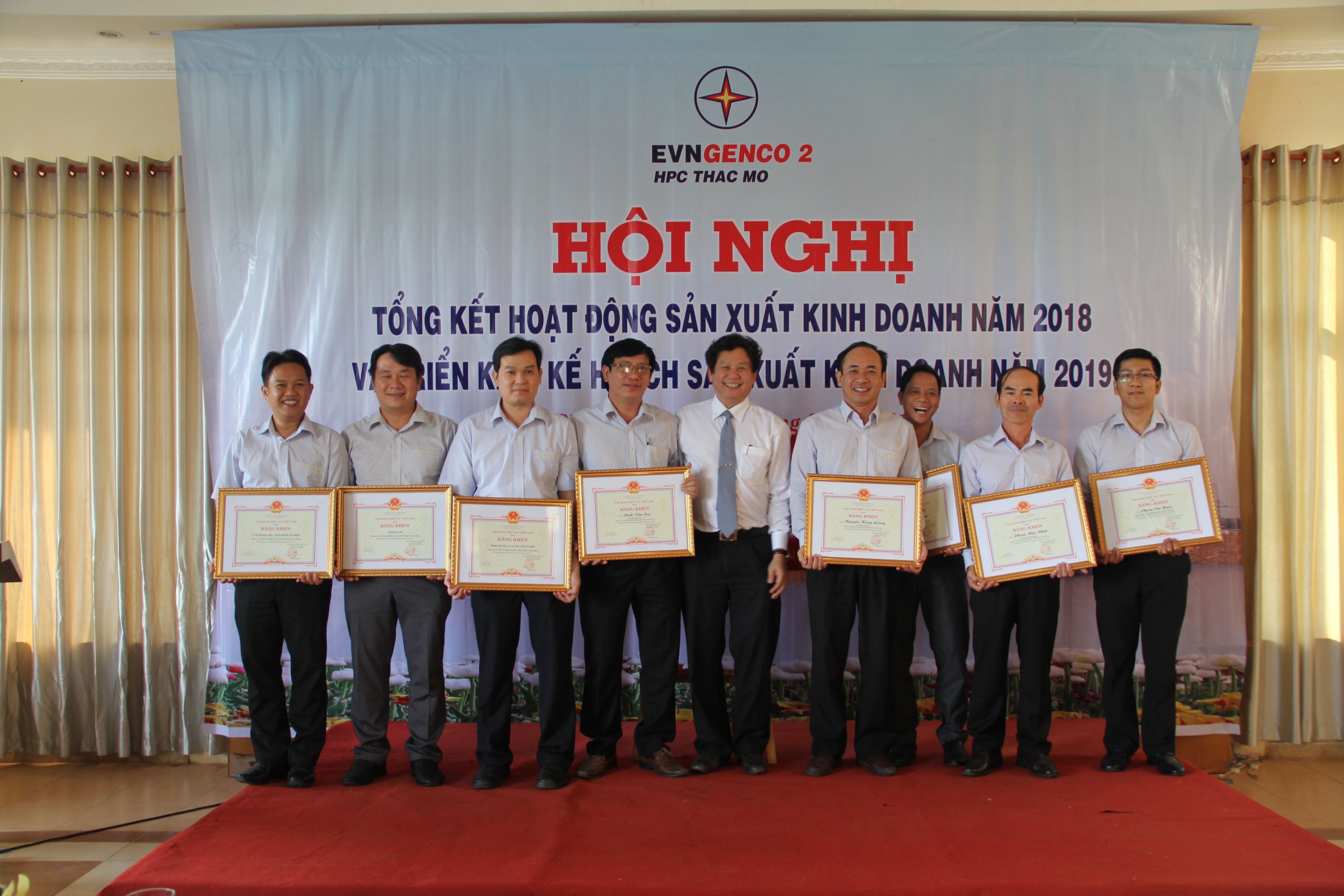 Ông Trương Hoàng Vũ – Tổng Giám đốc EVNGENCO2 (thứ tư từ phải sang), ông Huỳnh Văn Khánh –CT.HĐQT công ty (thứ 8 từ phải sang) và ông Trần Ngọc Tân Chủ tịch Công đoàn (thứ 9 từ phải sang) trao giấy khen EVNGENCO2 cho các cá nhân xuất sắc năm 2018