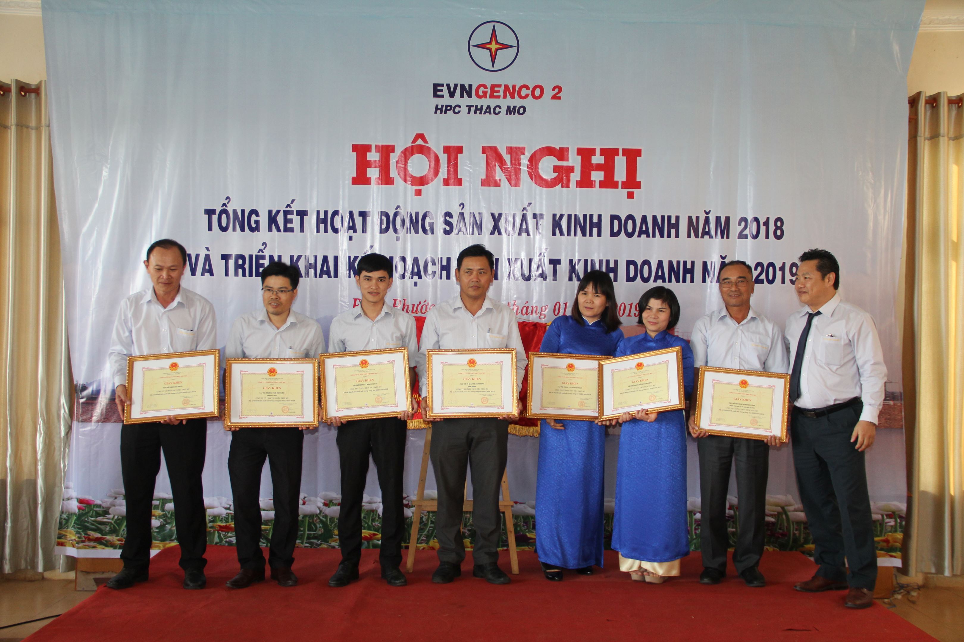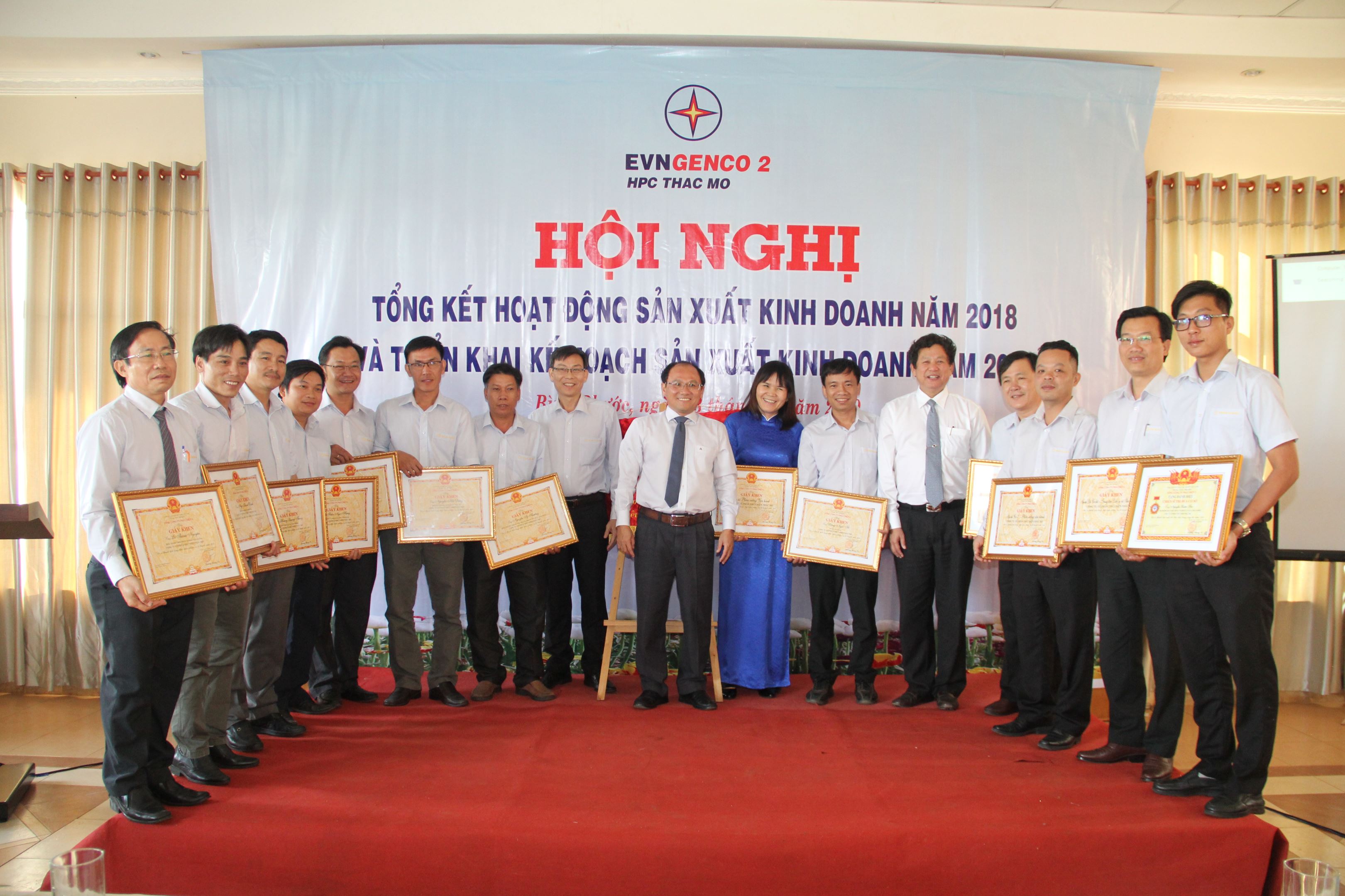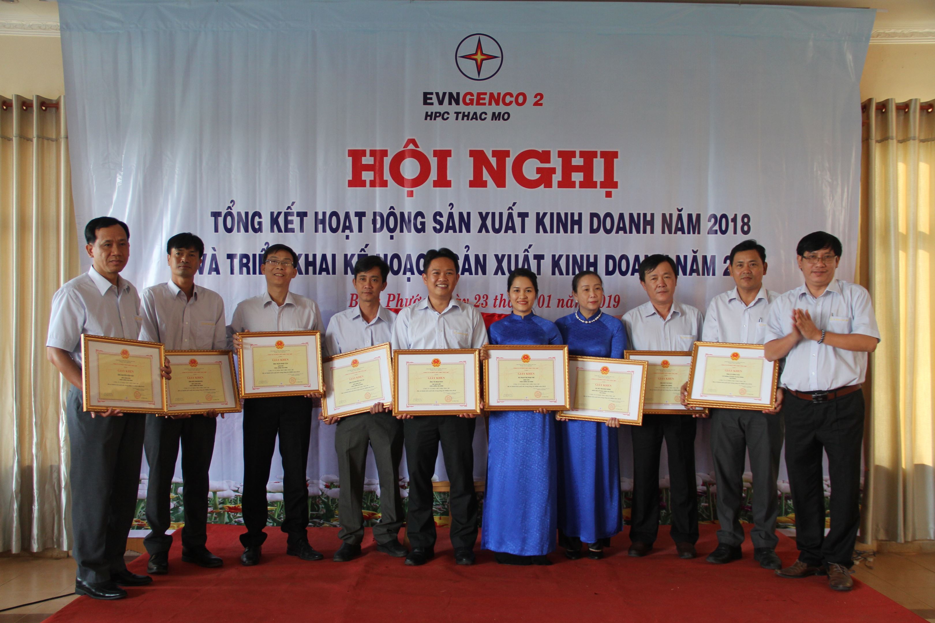 Ông Trương Hoàng Vũ – Tổng Giám đốc EVNGENCO2 (thứ tư từ phải sang), ông Huỳnh Văn Khánh –CT.HĐQT công ty (thứ 8 từ phải sang) và ông Trần Ngọc Tân Chủ tịch Công đoàn (thứ 9 từ phải sang) trao giấy khen EVNGENCO2 cho các cá nhân xuất sắc năm 2018