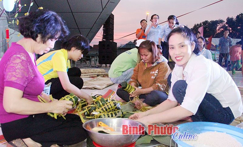 Mỗi đội dự thi gói bánh có 4 thành viên tham gia. Các đội có thể gói 10 đòn bánh tét hoặc 10 cái bánh chưng với nguyên liệu thực phẩm đảm bảo vệ sinh, sản phẩm làm ra phải nhanh, hình thức đẹp và chất lượng. Trong ảnh là đội dự thi của nhà trọ Thu Trang (Chơn Thành).