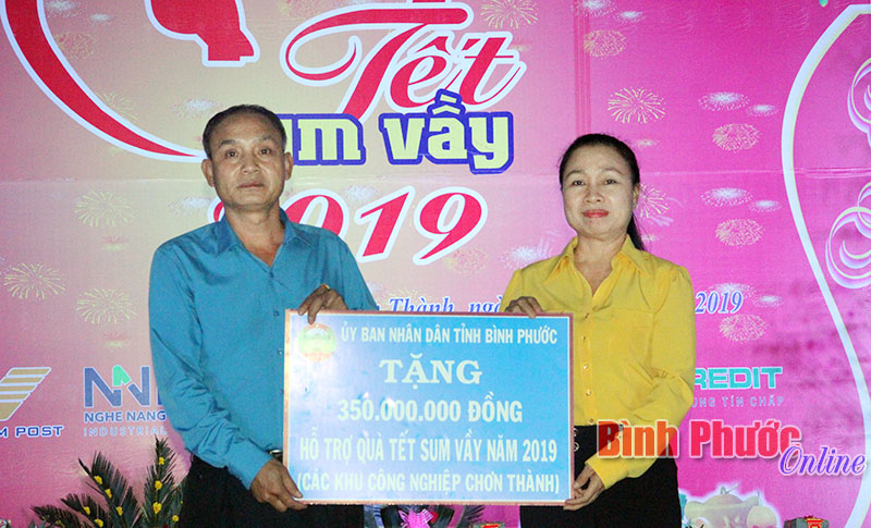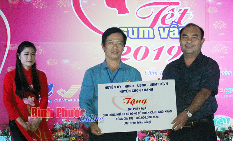 Đồng chí Nguyễn Tấn Hải, Ủy viên Ban Thường vụ Tỉnh ủy, Bí thư Huyện ủy Chơn Thành trao tượng trưng 200 phần quà tết của Huyện ủy, HĐND, UBND, UBMTTQVN huyện Chơn Thành cho công nhân nghèo, tổng trị giá 100 triệu đồng.
