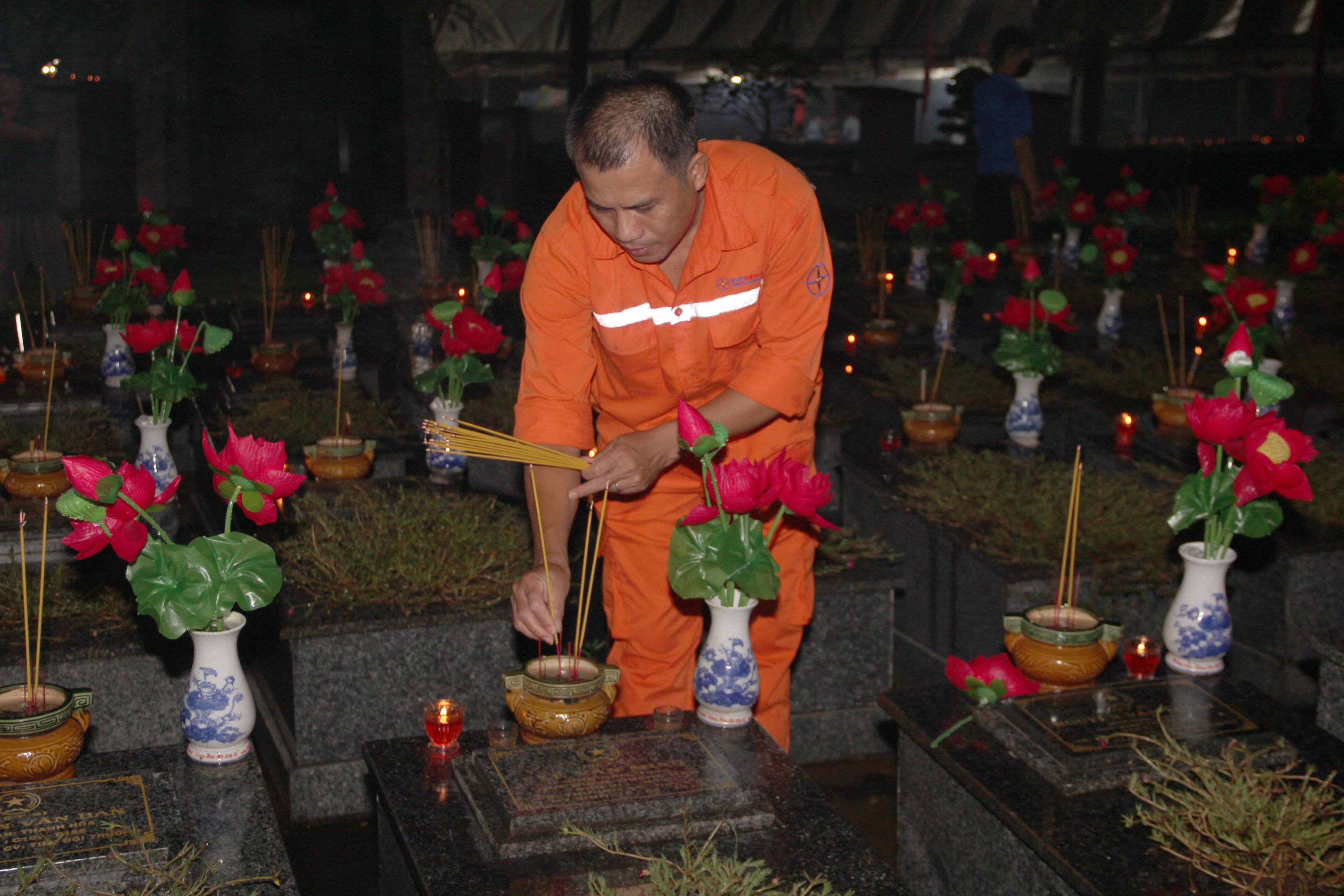 Tan ca trực, nhân viên TMP đến dâng hương và thắp nến tưởng niệm anh linh các anh hùng liệt sĩ tại Nghĩa trang Liệt sĩ thị xã Phước Long