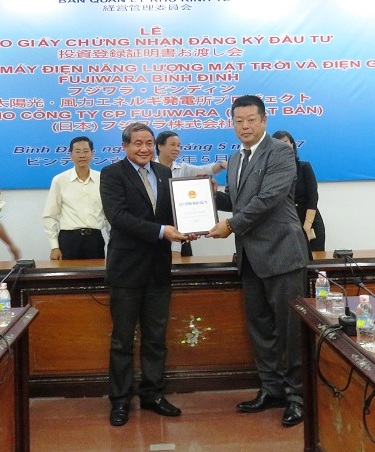 Ông Phan Cao Thắng, Phó Chủ tịch Thường trực UBND tỉnh Bình Định trao Giấy chứng nhận đầu tư cho ông Osamu Kimura, Chủ tịch Công ty Fujiwara Nhật Bản.