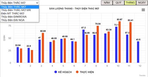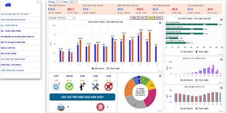 - Hiển thị thông tin về sản lượng điện/doanh thu sản xuất các nhà máy sản xuất điện/các công ty con, công ty liên kết: Cho phép xem theo ngày/tháng/quý/năm, trong đó thể hiện được các số liệu kế hoạch và thực hiện theo dạng biểu đồ trực quan có số liệu kèm theo