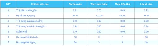 Theo dõi và quản lý các chỉ tiêu kinh tế kỹ thuật như các tham số: Điện tự dùng/Hệ số khả dụng/Tỷ lệ dừng máy sự cố/Tỷ lệ dừng máy bảo dưỡng/Suất sự cố/...) thực hiện so với kế hoạch đã đặt ra theo tháng/lũy kế thực hiện năm.