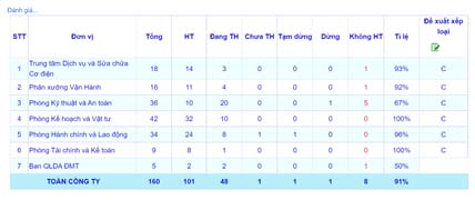 - Quản lý tình hình thực hiện công việc các đơn vị trong Công ty: Trong đó có đánh giá Tổng số công việc/số công việc hoàn thành/số công việc không hoàn thành/dừng/tạm dừng/... và tỷ lệ hoàn thành thành, đề xuất đánh giá xếp loại tháng. Nhằm tạo điều kiện thuận lợi cho lãnh đạo Công ty xem xét đánh giá từng đơn vị: