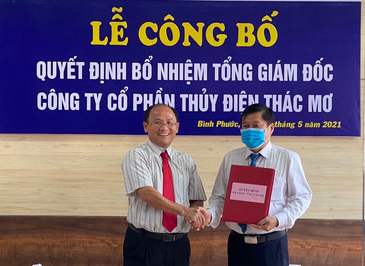 Ông Huỳnh Văn Khánh – phụ trách nhóm người đại diện EVNGENCO 2 tại TMP, Chủ tịch Hội đồng quản trị TMP (bên trái) thừa uỷ quyền EVNGENCO 2 trao quyết định bổ nhiệm.