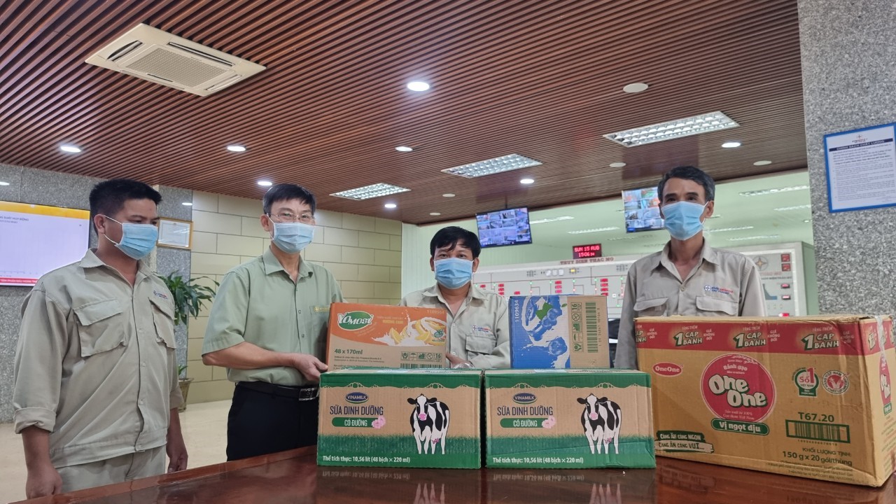 Ông Nguyễn Văn Non (thứ hai bên trái sang) đại diện Công đoàn Tổng công ty Phát điện 2 trao hỗ trợ CBCNV TMP