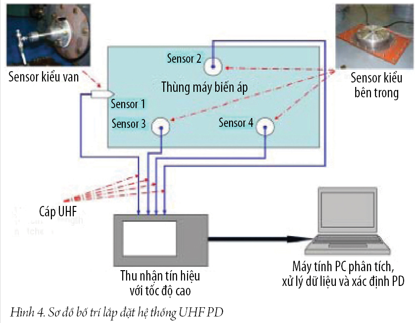 c. Sử dụng các sensor PD siêu cao tần (UHF) lắp đặt qua các cửa sổ thành MBA hoặc kiểu ống lắp đặt qua các van liên thông với dầu.