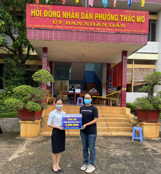 Bà Hồ Nguyễn Phương Trâm – Trưởng phòng Hành chính và Lao động TMP (bên trái) trao ủng hộ cho đại diện phường Thác Mơ