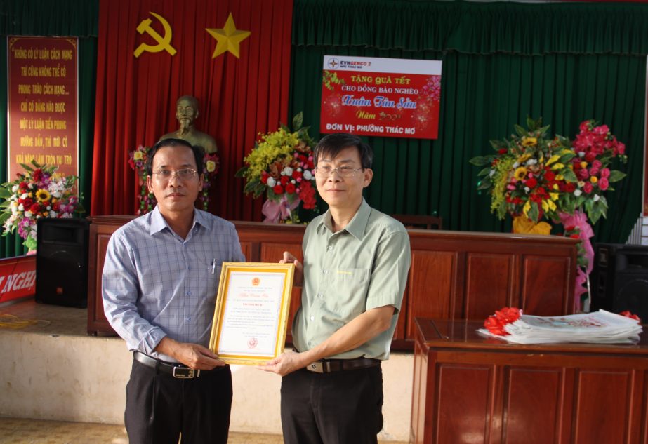 Chủ tịch Công đoàn Công ty Cổ phần Thuỷ điện Thác Mơ Trần Ngọc Tân (bên phải) nhận thư cảm ơn từ đơn vị phường Thác Mơ