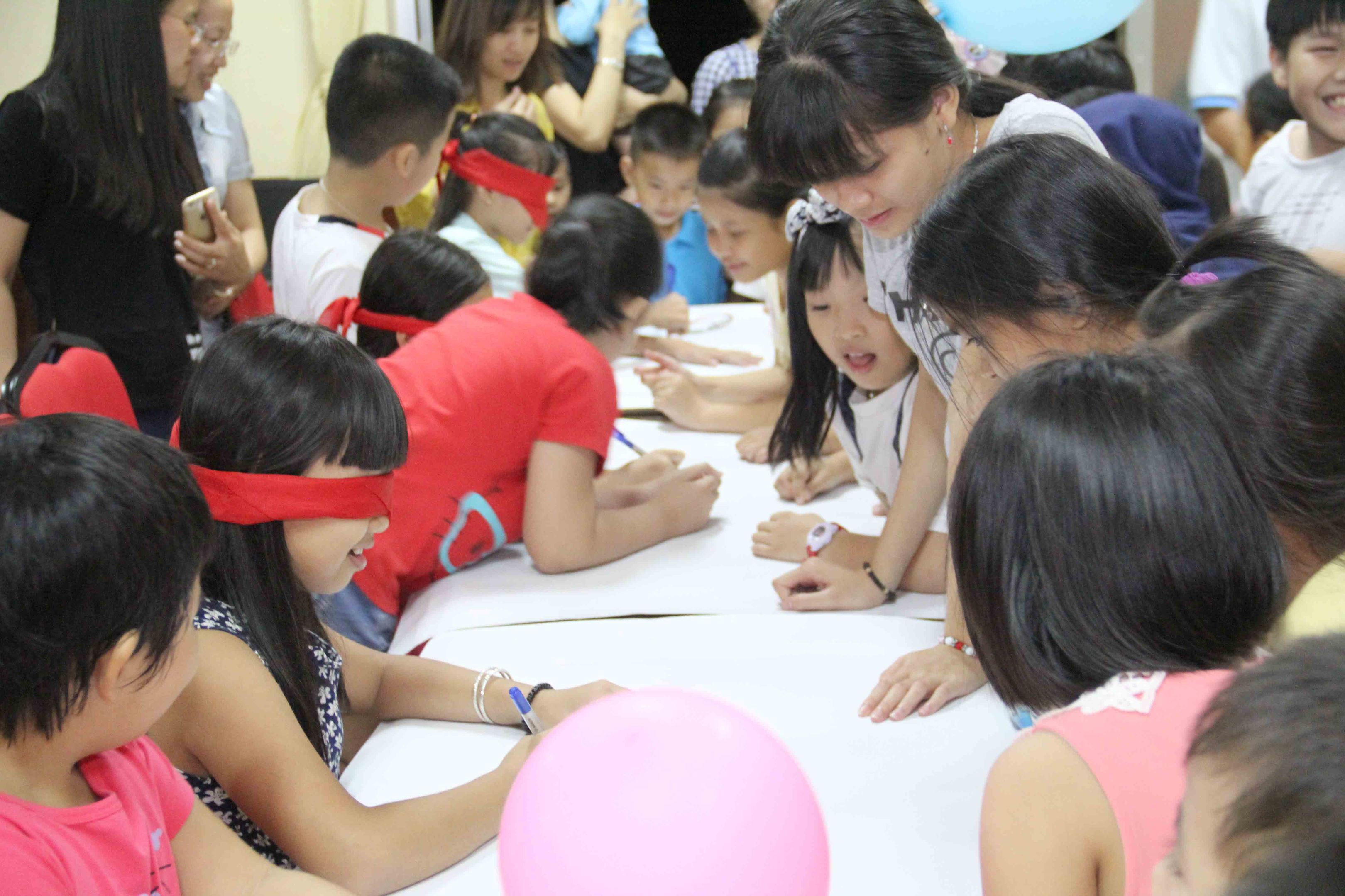 Các cháu tham gia trò chơi bịt mắt vẽ tranh