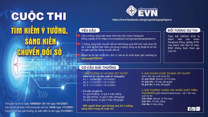 Theo thể lệ, ý tưởng, sáng kiến phải được trình bày trên nhóm Facebook Đồng nghiệp EVN (https://www.facebook.com/groups/dongnghiepevn). Nội dung viết không quá 200 chữ, kèm theo tối đa 1 hình vẽ thể hiện được nội dung ý tưởng, công cụ kỹ thuật số (mobile, web, mạng xã hội doanh nghiệp, các phần mềm/ứng dụng, các nền tảng kỹ thuật số, kênh thanh toán...) và mô tả ngắn gọn tác động chuyển đổi số của ý tưởng, sáng kiến CĐS. Mỗi CBCNV EVN tham gia không quá 03 ý tưởng, sáng kiến trong cả cuộc thi.
