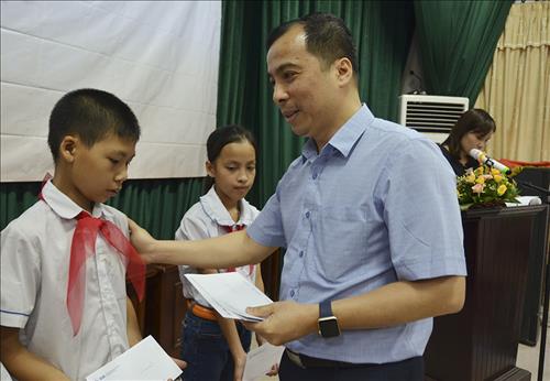 Ông Ngô Sơn Hải - Phó Tổng giám đốc EVN trao học bổng cho các em học sinh
