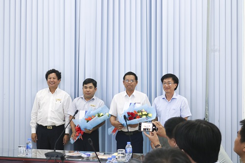 Chủ tịch EVNGENCO 2 (ngoài cùng bên phải) và Tổng Giám đốc trao Quyết định và tặng hoa chúc mừng các cán bộ được bổ nhiệm.