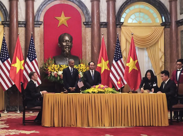 Đại diện Bộ Công Thương Việt Nam và GE ký biên bản ghi nhớ trước sự chứng kiến của Chủ tịch nước Trần Đại Quang và Tổng thống Mỹ Barack Obama - Ảnh: Bộ Công Thương cung cấp.