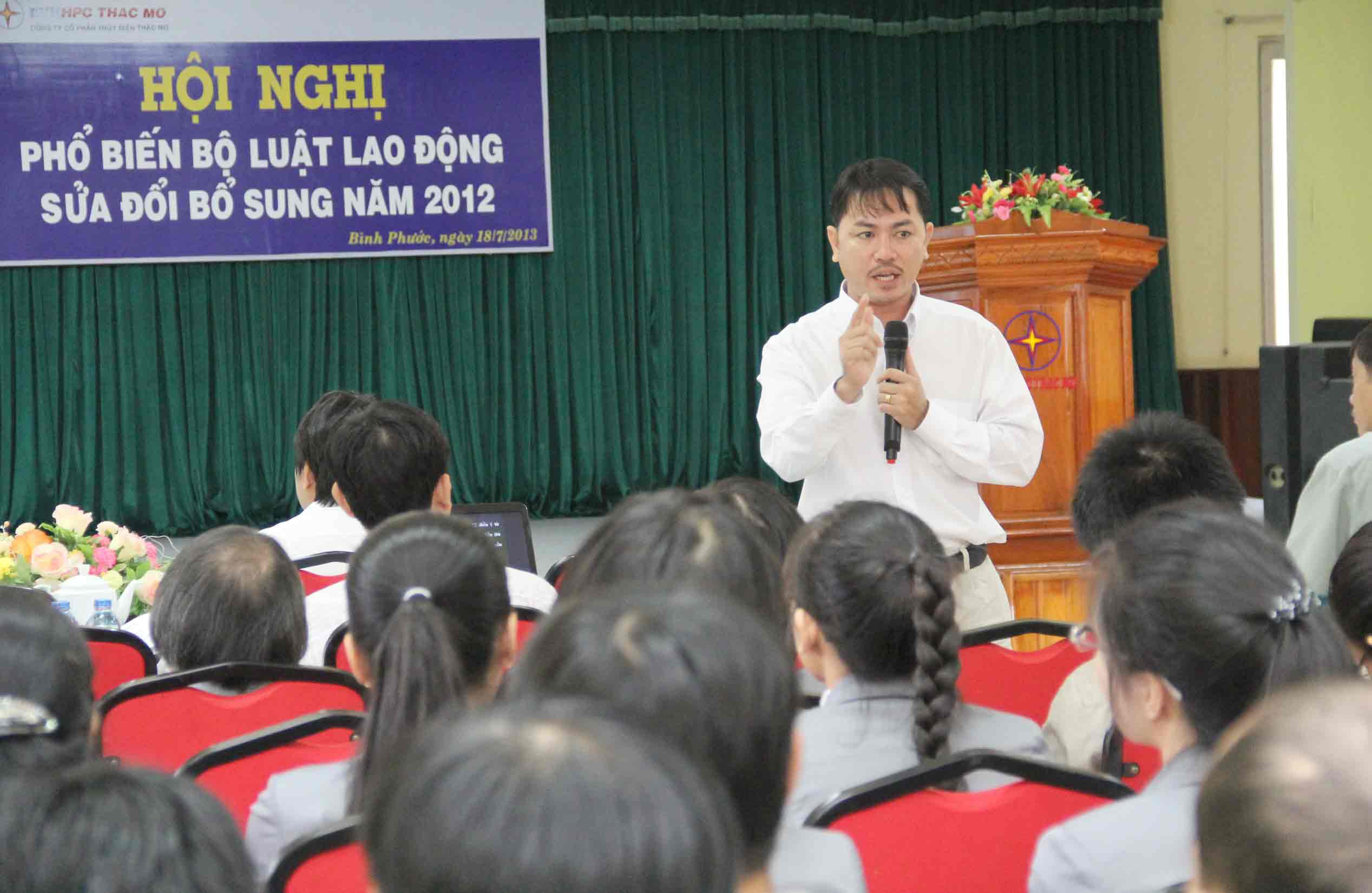 Cán bộ giảng dạy thuộc Sở LD-TBXH tỉnh Bình Phước đã thuyết trình, phổ biến Luật lao động sửa đổi, bổ sung năm 2012 đến Hội nghị. BLLĐ 2012 gồm 17 Chương, 242 Điều, có hiệu lực thi hành từ ngày 1.5.2013. Bộ luật tạo sự linh hoạt cho các DN; tạo thêm quyền hạn cho các cấp của địa phương trong việc giải quyết các tranh chấp về LĐ; một số thay đổi quan trọng trong BLLĐ 2012 liên quan tới tiền lương, thời giờ làm việc và làm thêm giờ; hợp đồng LĐ - trong đó có vấn đề về cho thuê lại LĐ, các hợp đồng, tuyển dụng và thôi việc…