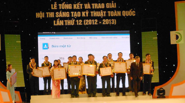Nhóm tác giả CPCETC (bên phải) đạt giải Nhất tại lễ tổng kết Hội thi Sáng tạo kỹ thuật toàn quốc lần thứ 12. (Nguồn ảnh: Internet)