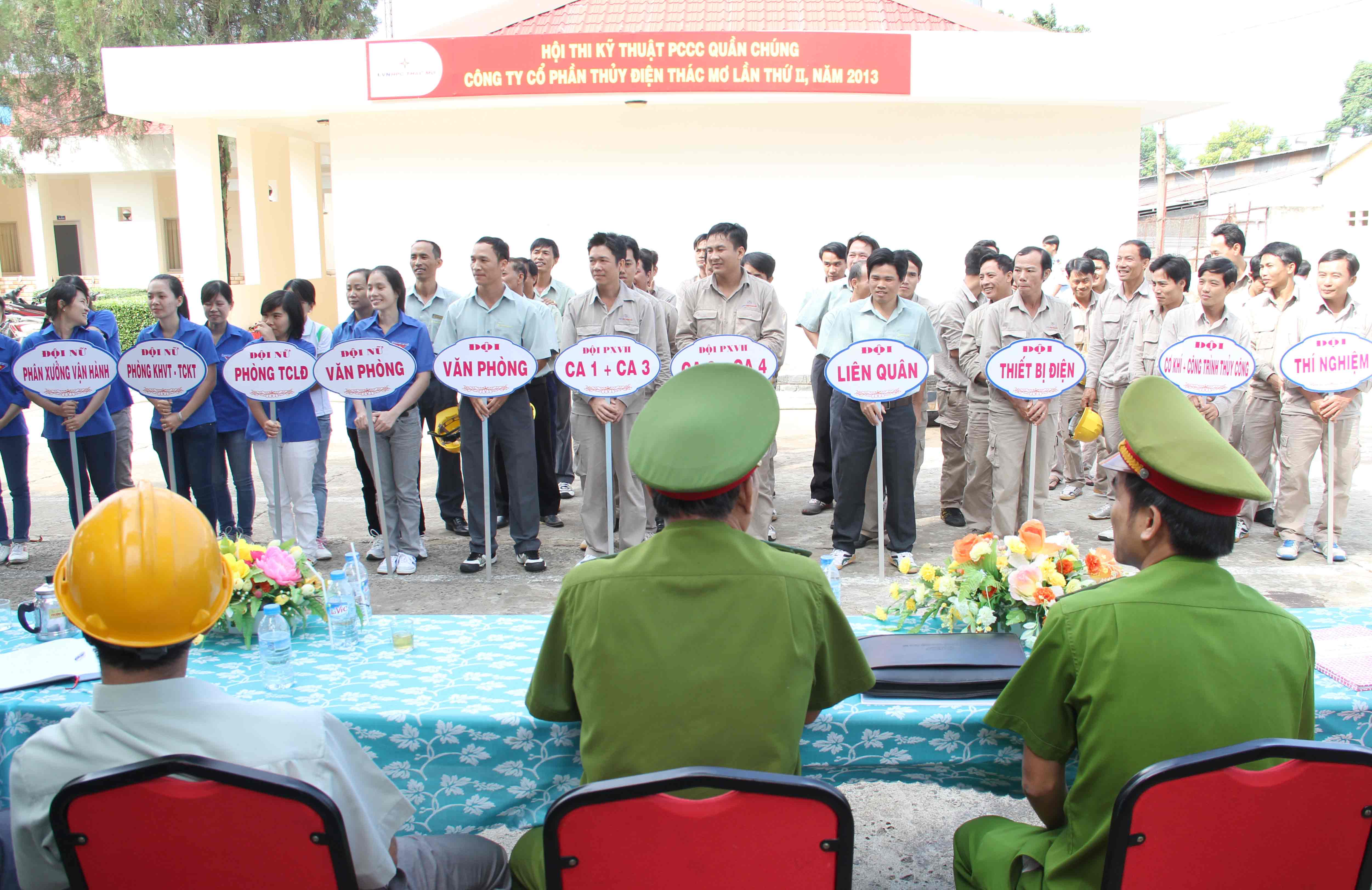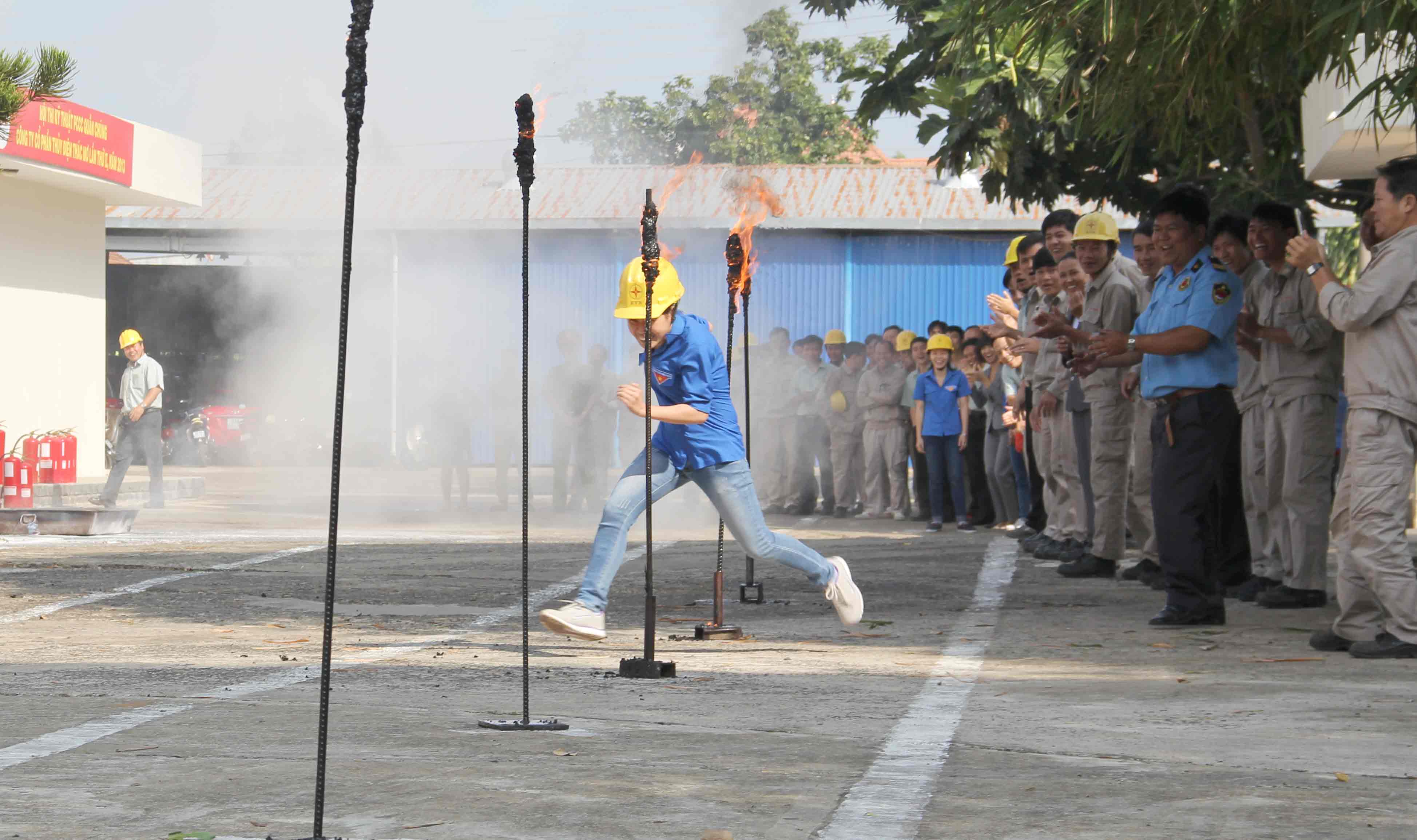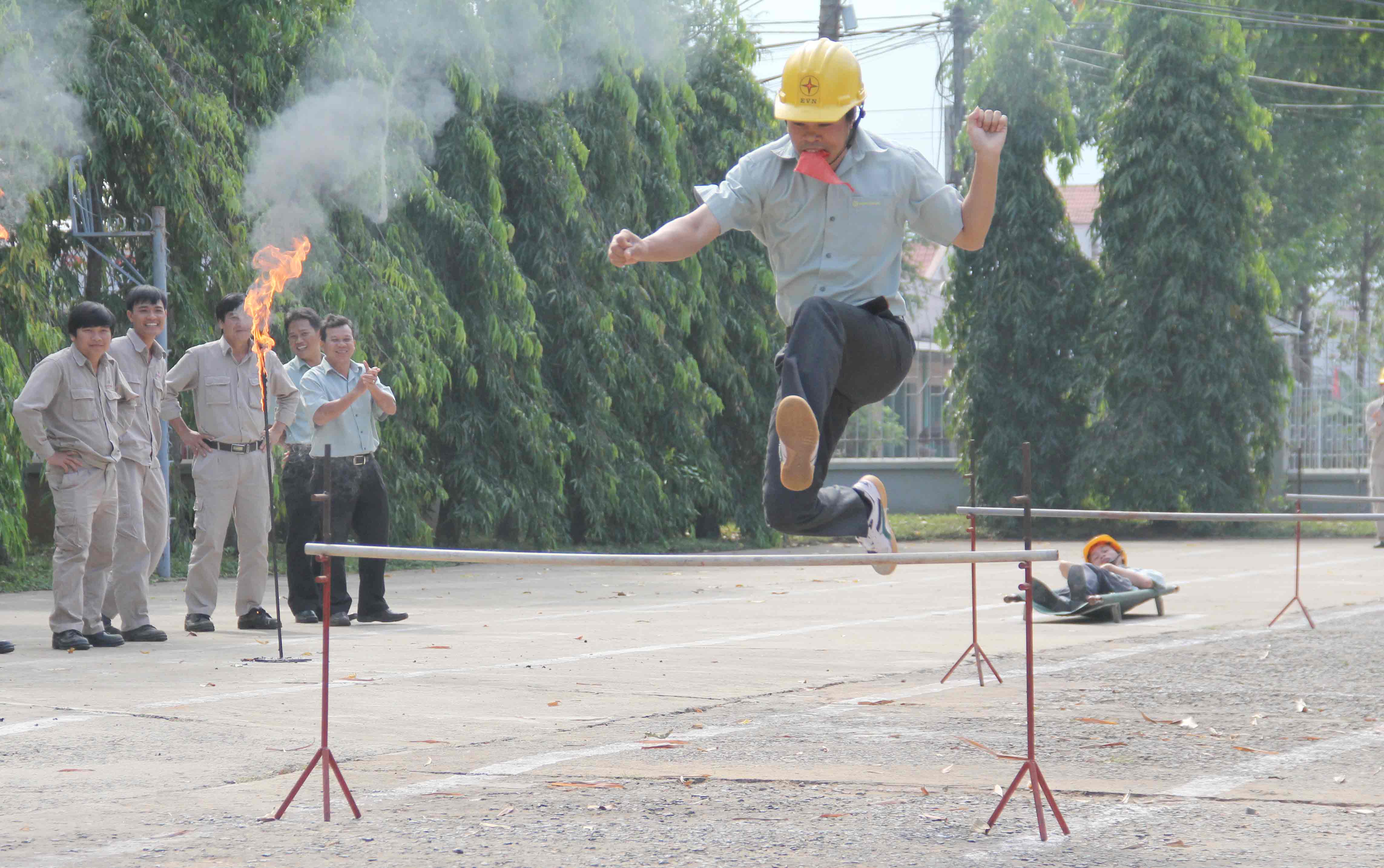 Sau khi ông Nguyễn Sỹ Thưởng – Chánh Văn phòng, kiêm đội trưởng Đội PCCC Công ty phổ biến nội dung Quy trình PCCC - Công ty ban hành tại hội trường; phần thực hành 12 đội dự thi của hai hệ ( Nam và Nữ ) đã bước vào tranh tài đội hình thi đấu 300m đối với hệ Nam và 150m đối với hệ Nữ tiếp sức, dùng bình bột chữa cháy MTF8 dập tắt đám cháy - cứu tài sản – cứu người bị nạn…