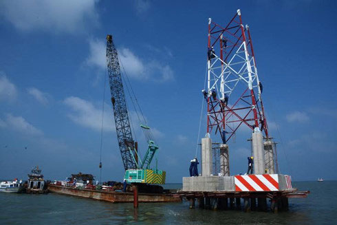 Liên danh nhà thầu gồm Công ty CP Cơ khí Kiên Giang và Công ty Cienco1 đang triển khai thi công trụ điện của đường dây 110 kV vượt biển