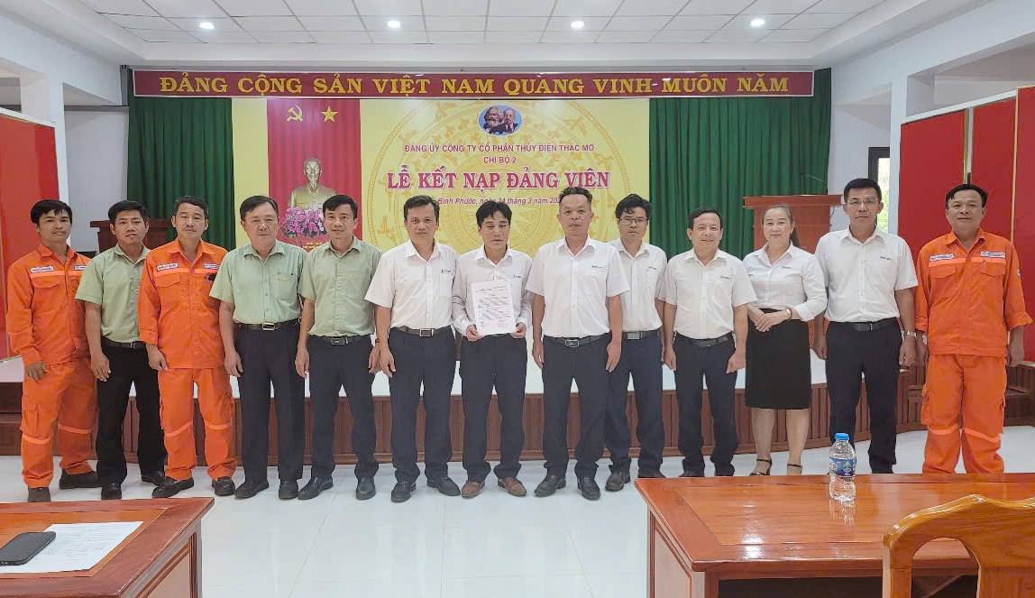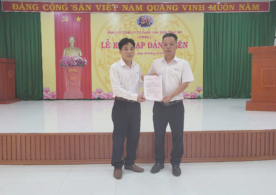 Đồng chí Nguyễn Hải Đăng, Bí thư Chi bộ 2, trao quyết định kết nạp đảng cho quần chúng Nguyễn Xuân Sơn