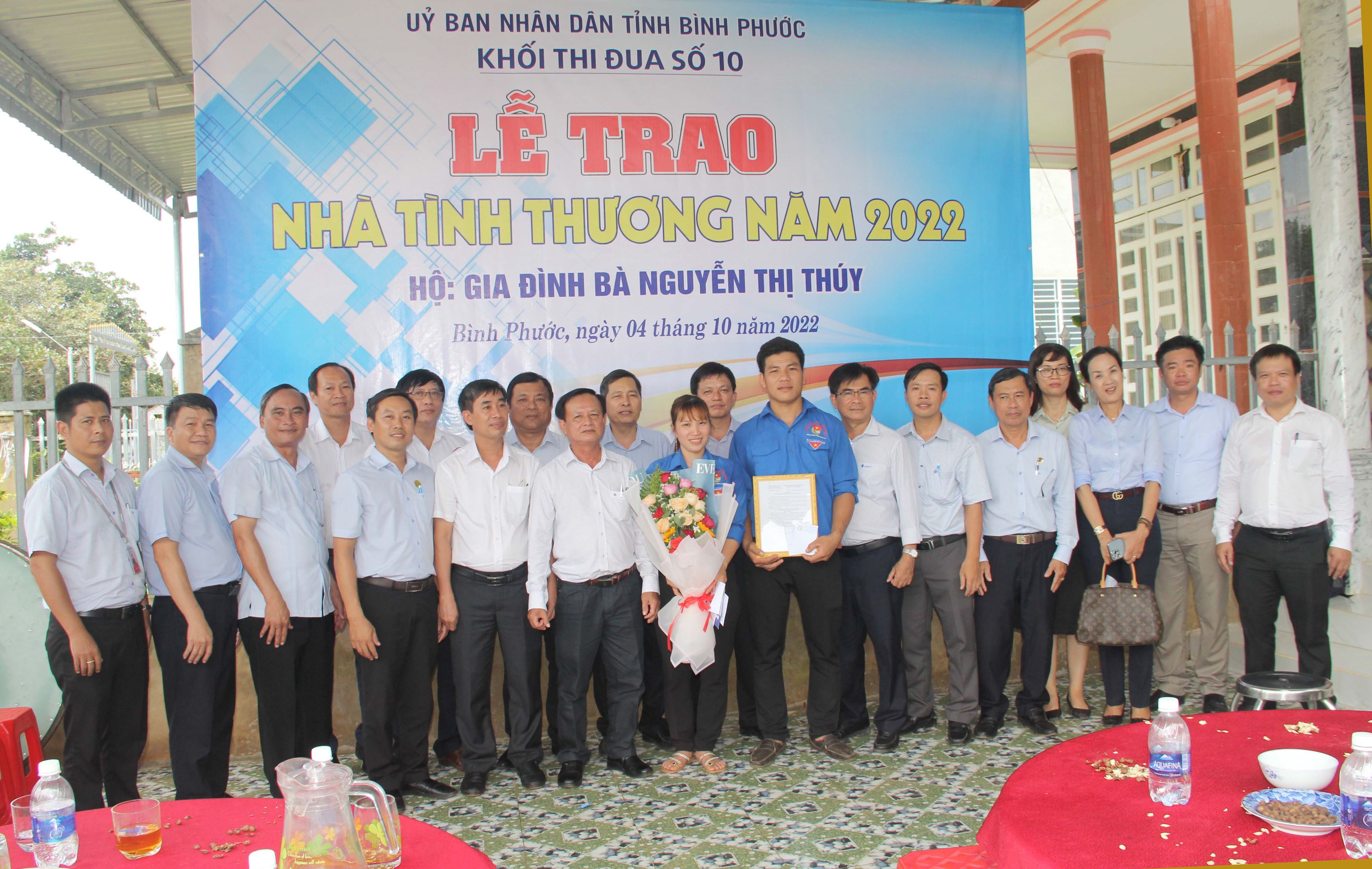 Năm 2022, theo kế hoạch Khối thi đua số 10 sẽ hỗ trợ xây tặng 4 căn nhà tình thương, trị giá mỗi căn là 80.000.000 đồng, tổng chi phí là 320.000.000 đồng. Qua kiểm tra, xem xét, Khối thi đua số 10 đã thống nhất hỗ trợ xây tặng 04 căn nhà tình thương cho gia đình người lao động có hoàn cảnh khó khăn, gồm: (1) gia đình ông Lâm Văn Hùng, công nhân Công ty CPTĐ Srok Phu Miêng (IDICO); (2) gia đình bà Nguyễn Thị Thùy Dương, nhân viên Bưu điện tỉnh Bình Phước; (3) gia đình ông Hoàng Công Hải, nhân viên Công ty Xăng dầu Bình Phước; (4) gia đình bà Nguyễn Thị Thúy, công nhân Nông trường Cao su Thuận Phú, Công ty Cổ phần Cao su Đồng Phú.
