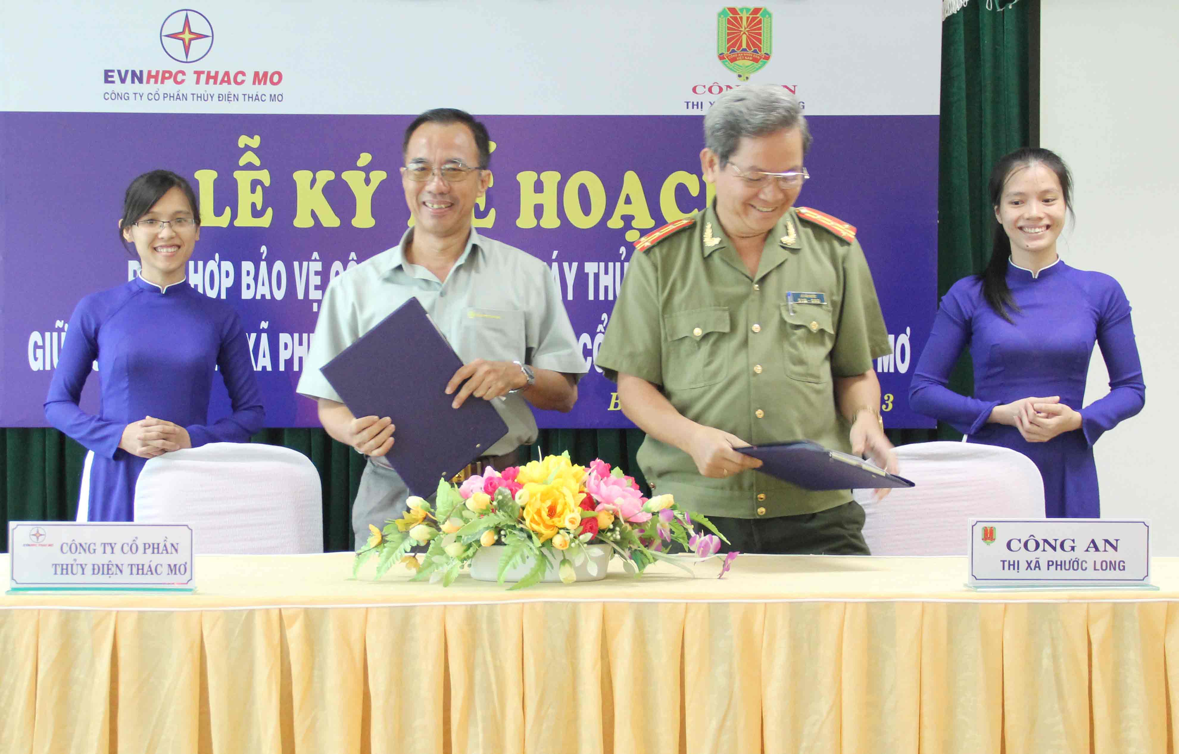 Trong lễ ký kết, ông Nguyễn Sỹ Thưởng – Chánh văn phòng – đại diện cho Lãnh đạo hai đơn vị đã báo cáo tóm tắt tình hình, kết quả công tác phối hợp bảo vệ công trình Nhà máy thủy điện Thác Mơ ( từ năm 1997 đến nay) giữa các đơn vị nghiệp vụ của Công an tỉnh Bình Phước, Công an các huyện – thị với Công ty cổ phần thủy điện Thác Mơ…; Để cụ thể hóa làm rõ các nội dung Kế hoạch phối hợp bảo vệ công trình, các Đội nghiệp vụ Công an thị xã Phước Long và các phòng nghiệp vụ của Công an tỉnh Bình Phước có nhiều ý kiến đóng góp, nhằm thực hiện tốt công tác phối hợp bảo vệ an toàn công trình Nhà máy thủy điện Thác Mơ, một trong những công trình kinh tế trọng điểm của tỉnh, có hồ chứa quan trọng cấp quốc gia (dung tích 1,36 tỷ m3 nước). Sau khi thảo luận và cùng thống nhất quan điểm, ông Nguyễn Thanh Phú – Chủ tịch HĐQT kiêm Tổng Giám đốc - Đại diện Công ty cổ phần thủy điện Thác Mơ và đồng chí Lê Văn Nước – Trưởng Công an thị xã - Đại diện Công thị xã Phước Long đã cùng ký Kế hoạch phối hợp bảo vệ an toàn công trình Nhà máy thủy điện Thác Mơ.