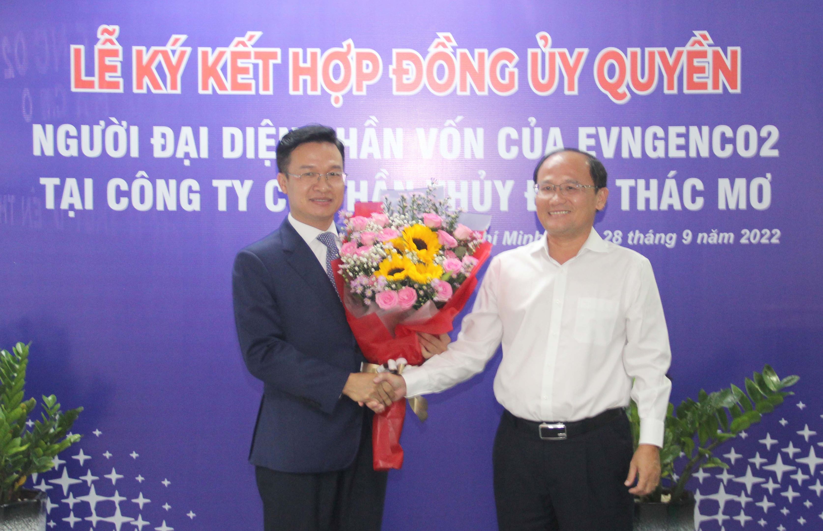 Ông Trần Phú Thái – Chủ tịch Hội đồng quản trị EVNGENCO2 trao ký kết Hợp đồng ủy quyền Người đại diện phần vốn của EVNGENCO2 cho ông Nguyễn Lê Hoàng