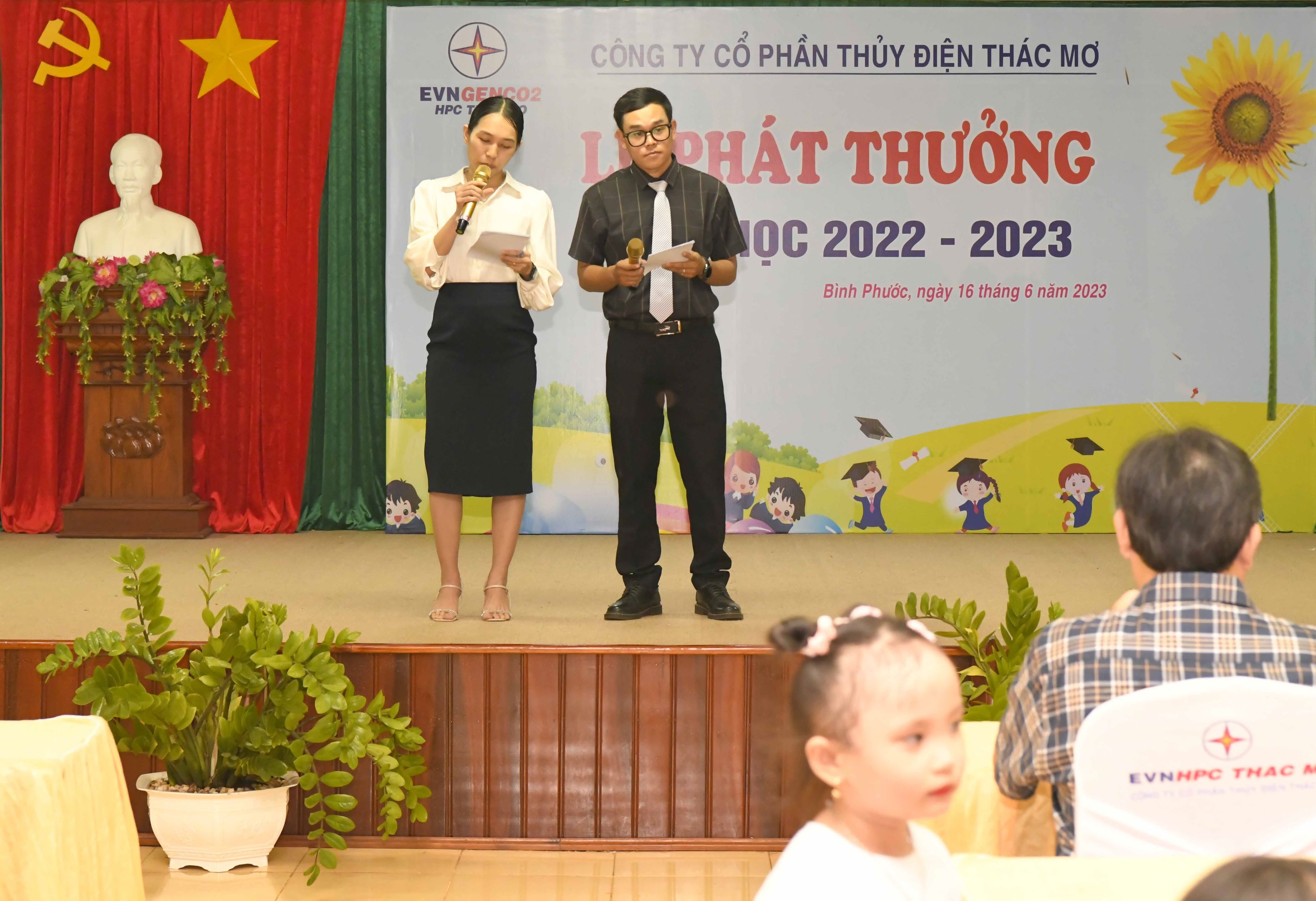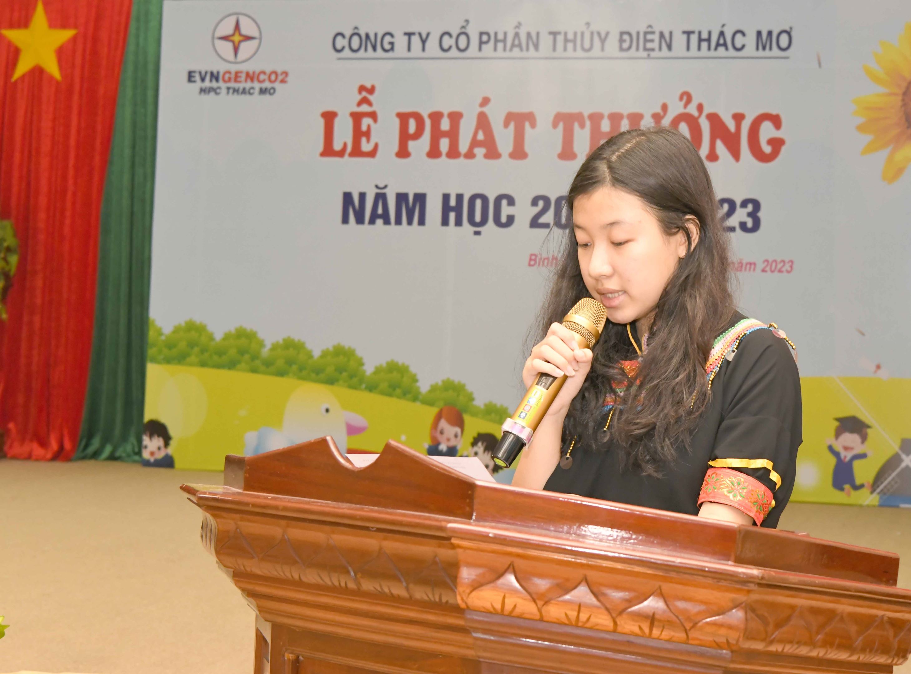 Với tấm lòng biết ơn sâu sắc, thay mặt các em học sinh, em Bùi Nguyễn Tuyết Mai phát biểu: “Con rất vinh dự được đại diện cho các bạn có thành tích học tập trong năm học 2022-2023 phát biểm cảm nghĩ. Lời đầu tiên, con xin gởi lời cảm ơn đến các bác, các chú trong ban Lãnh đạo Tổng công ty Điện lực 2 và Công ty cổ phần Thủy điện Thác Mơ đã quan tâm sâu sắc, động viên tinh thần học tập của chúng con; nhân đây con xin mang ơn cha – mẹ, đã có công sinh thành, nuôi dưỡng, hết lòng yêu thương, dạy dỗ, để chúng con đạt được nhiều thành tích trong học tậpnhư ngày hôm nay. Chúng con xin hứa sẽ nổ lực học tập hơn nữa, tu dưỡng đạo đức để trở thành con ngoan – trò giỏi, xứng đáng với niềm tin yêu của cha – mẹ và sự tin tưởng của các bác, các Chú trong ban Lãnh đạo Tổng công ty Điện lực 2, Công ty cổ phần Thủy điện Thác Mơ”