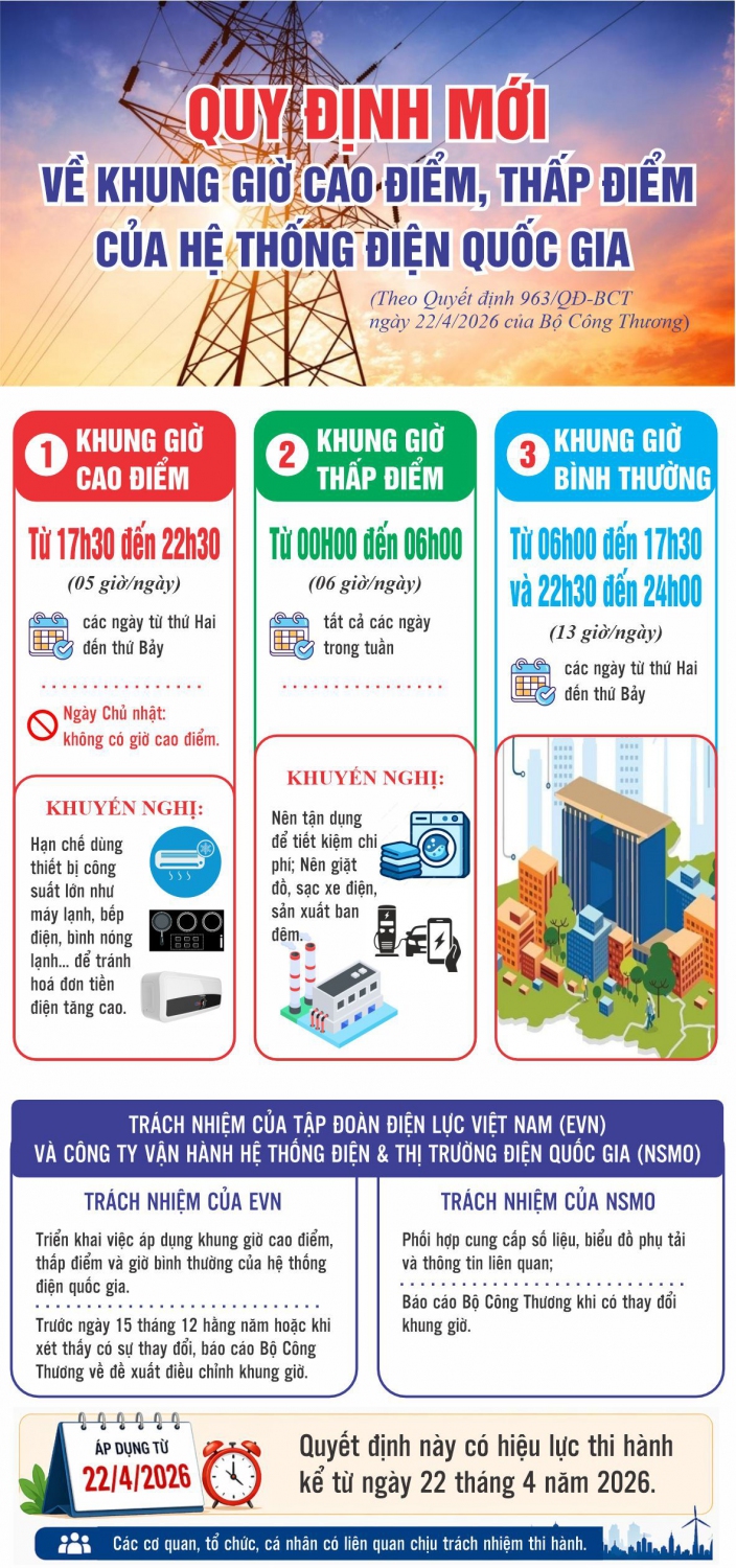 Tập đoàn Điện lực Việt Nam tổ chức triển khai áp dụng khung giờ cao điểm, thấp điểm và giờ bình thường của hệ thống điện quốc gia theo đúng quy định. Đồng thời, trước ngày 15/12 hằng năm hoặc khi có sự thay đổi về biểu đồ phụ tải điện, báo cáo Bộ Công Thương về việc đề xuất điều chỉnh khung giờ phù hợp với tình hình thực tế.