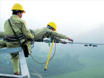 Công nhân TTĐ Thái Nguyên đặt tiếp địa dây chống sét để sửa chữa phụ kiện.
