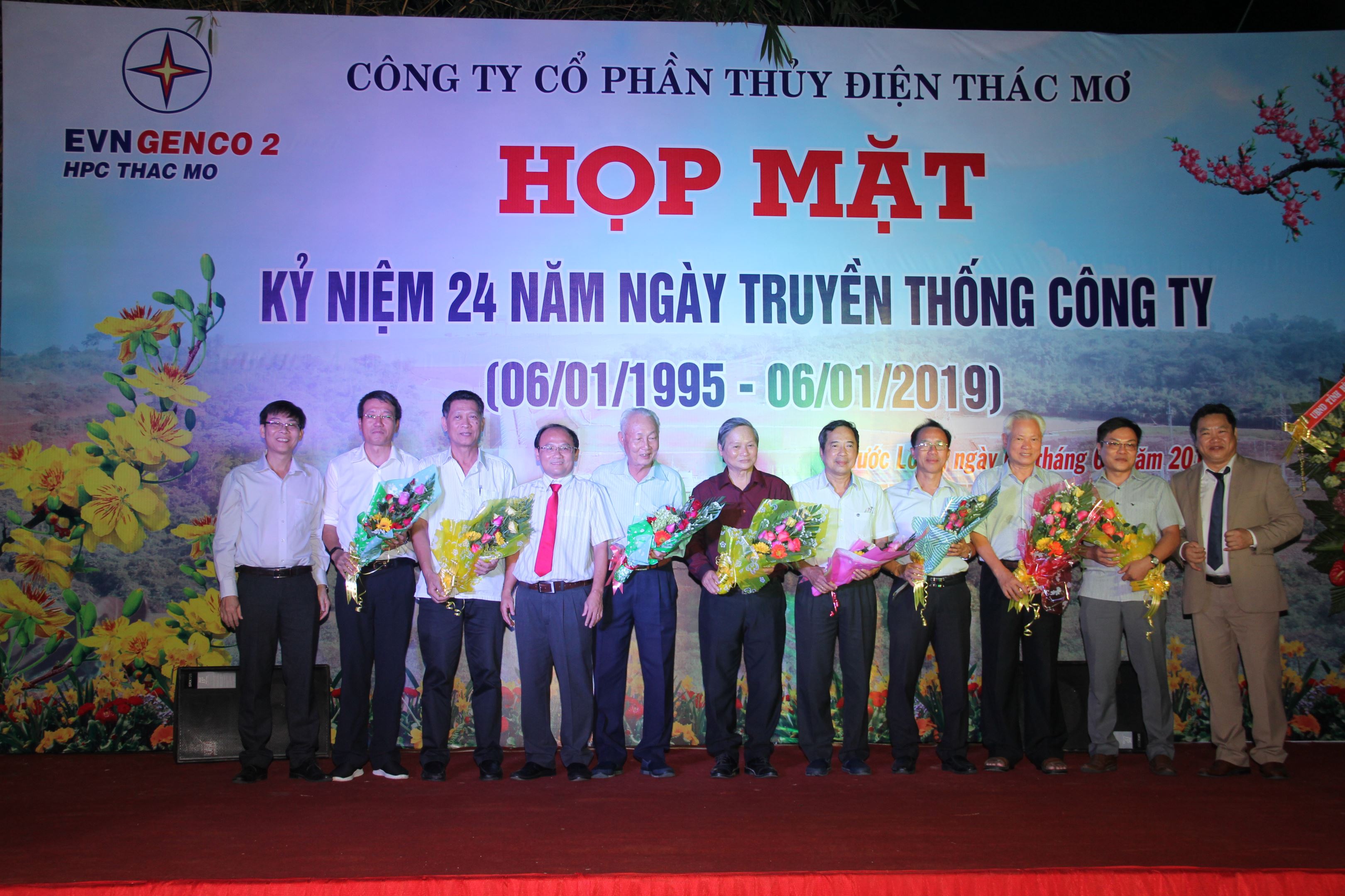 Ông Huỳnh Văn Khánh Chủ tịch HĐ QT (thứ 4 bên trái sang) và Ông: Lê Minh Tuấn - ủy viên HĐQT- Tổng GĐ Công ty (ngoài cùng bên phải), ông Trần Ngọc Tân- Chủ tịch Công đoàn công ty (ngoài cùng bên trái) tặng hoa cho nguyên Lãnh đạo EVN, Lãnh đạo Ban QLDA thủy điện Thác Mơ , Lãnh đạo Công ty qua các thời kỳ