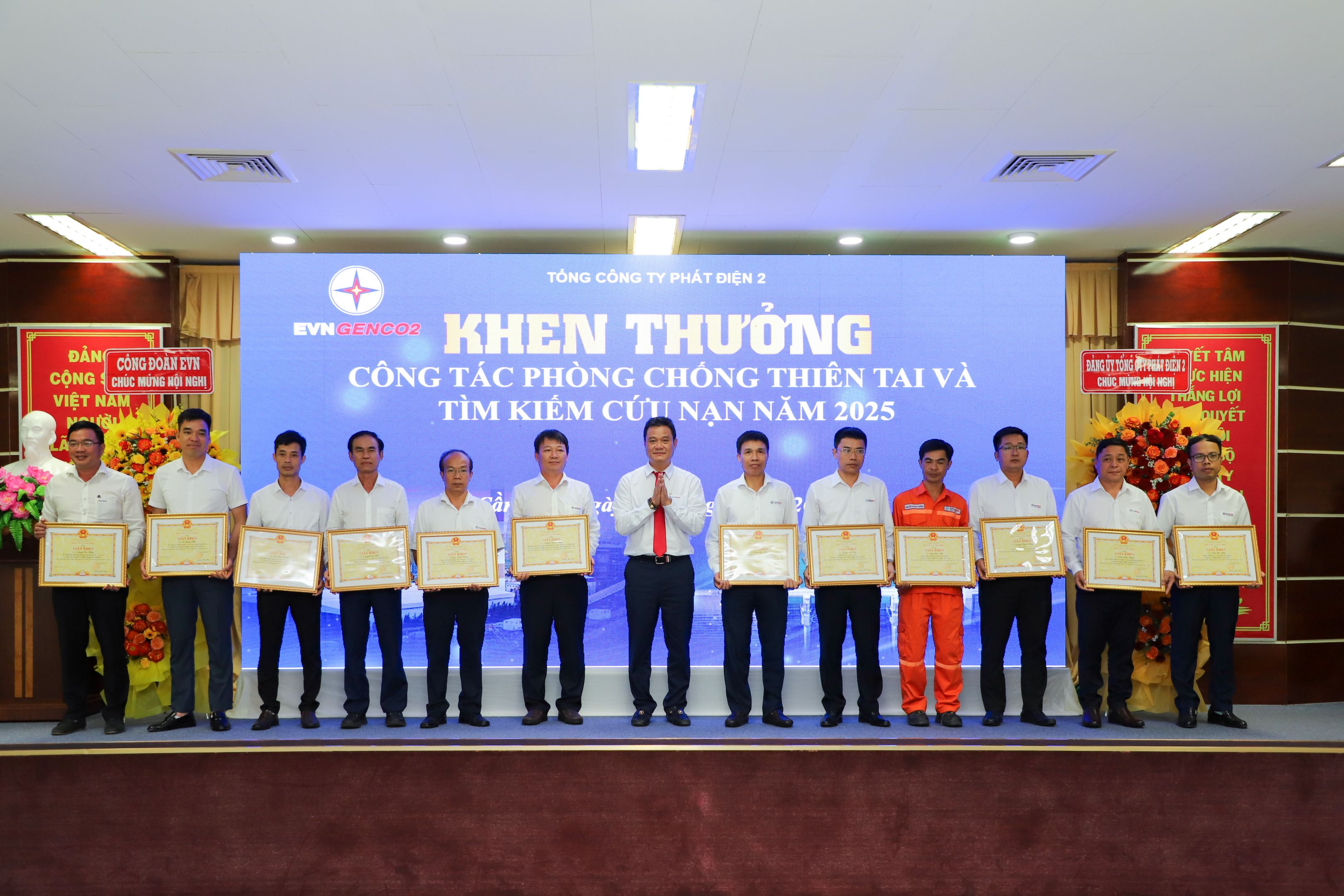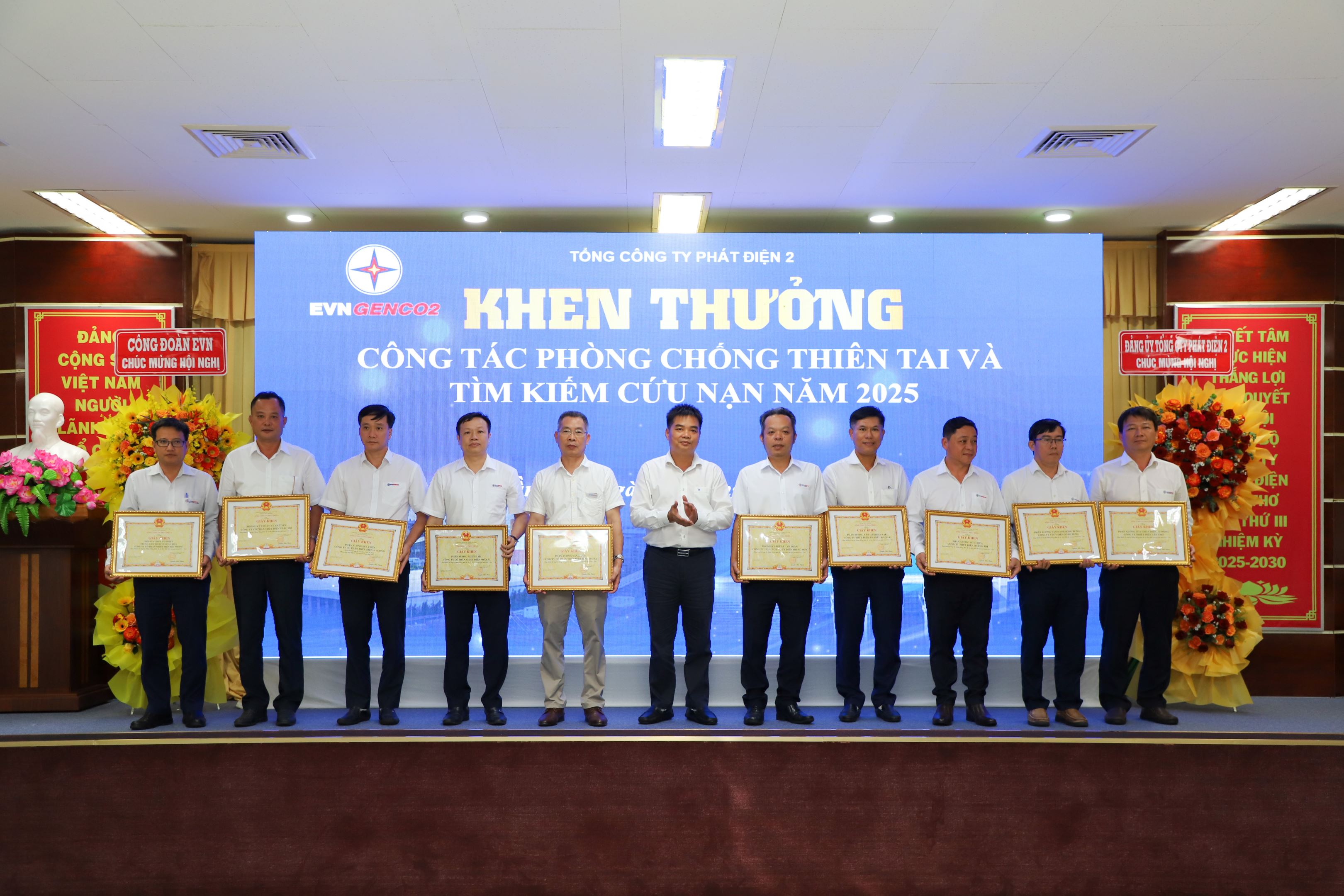 Ông Nguyễn Văn Ngộ - Phó Chủ tịch Công đoàn EVNGENCO2 (thứ 6 từ phải sang) trao khen thưởng trong công tác PCTT&TKCN giai đoạn 2022–2025 cho đại diện Phòng Kỹ thuật và An toàn (ông Nguyễn Hải Đăng, thứ 5 từ phải sang) (Ảnh: Minh Lương)