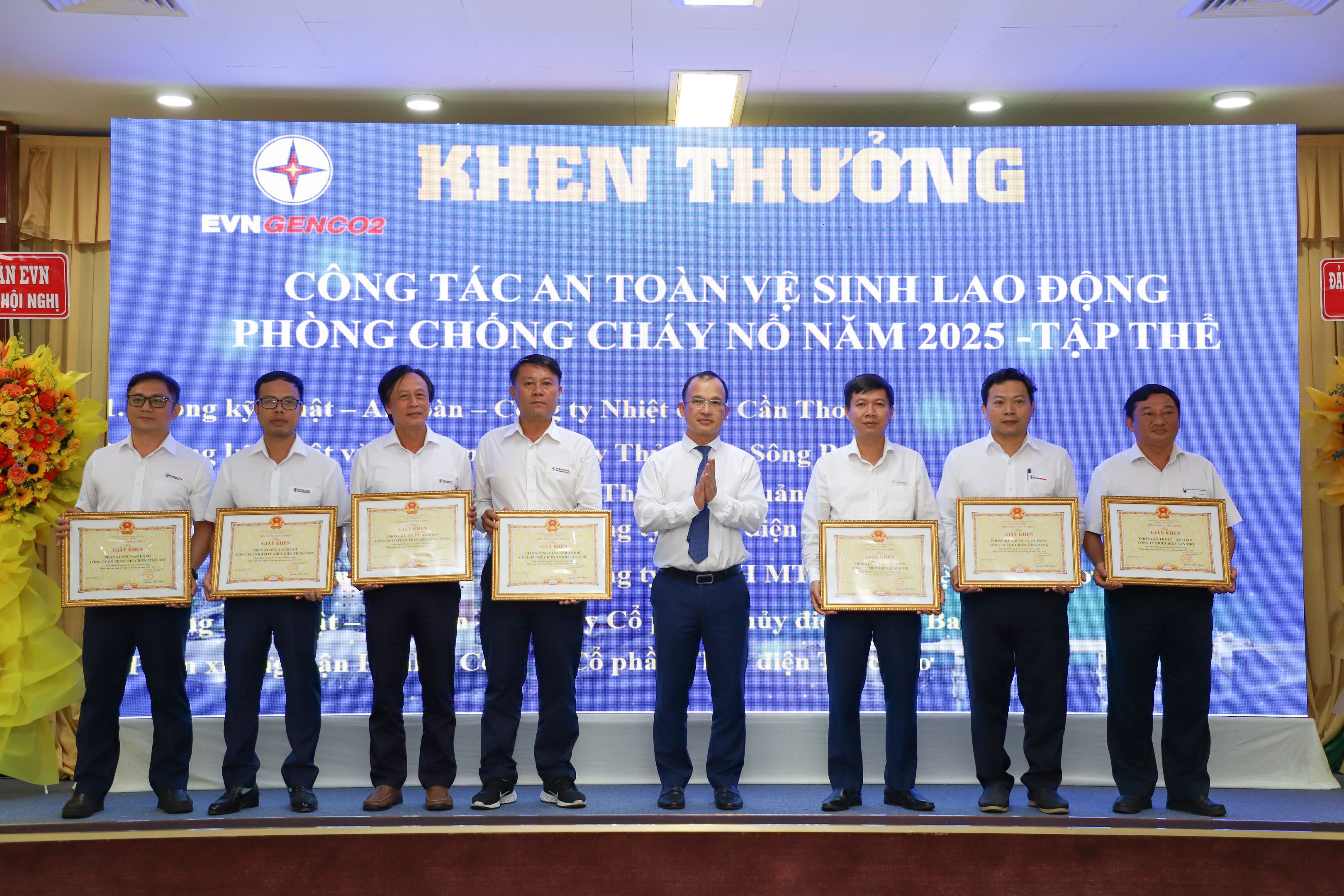 Ông Nguyễn Hữu Thịnh - Tổng giám đốc EVNGENCO2 (thứ 4 từ phải sang) trao khen thưởng trong công tác ATVSLĐ, PCCN giai đoạn 2022–2025 cho đại diện Phân Xưởng Vận hành (ông Hồ Như Thiện Thọ, thứ nhất từ trái sang) (Ảnh: Minh Lương)