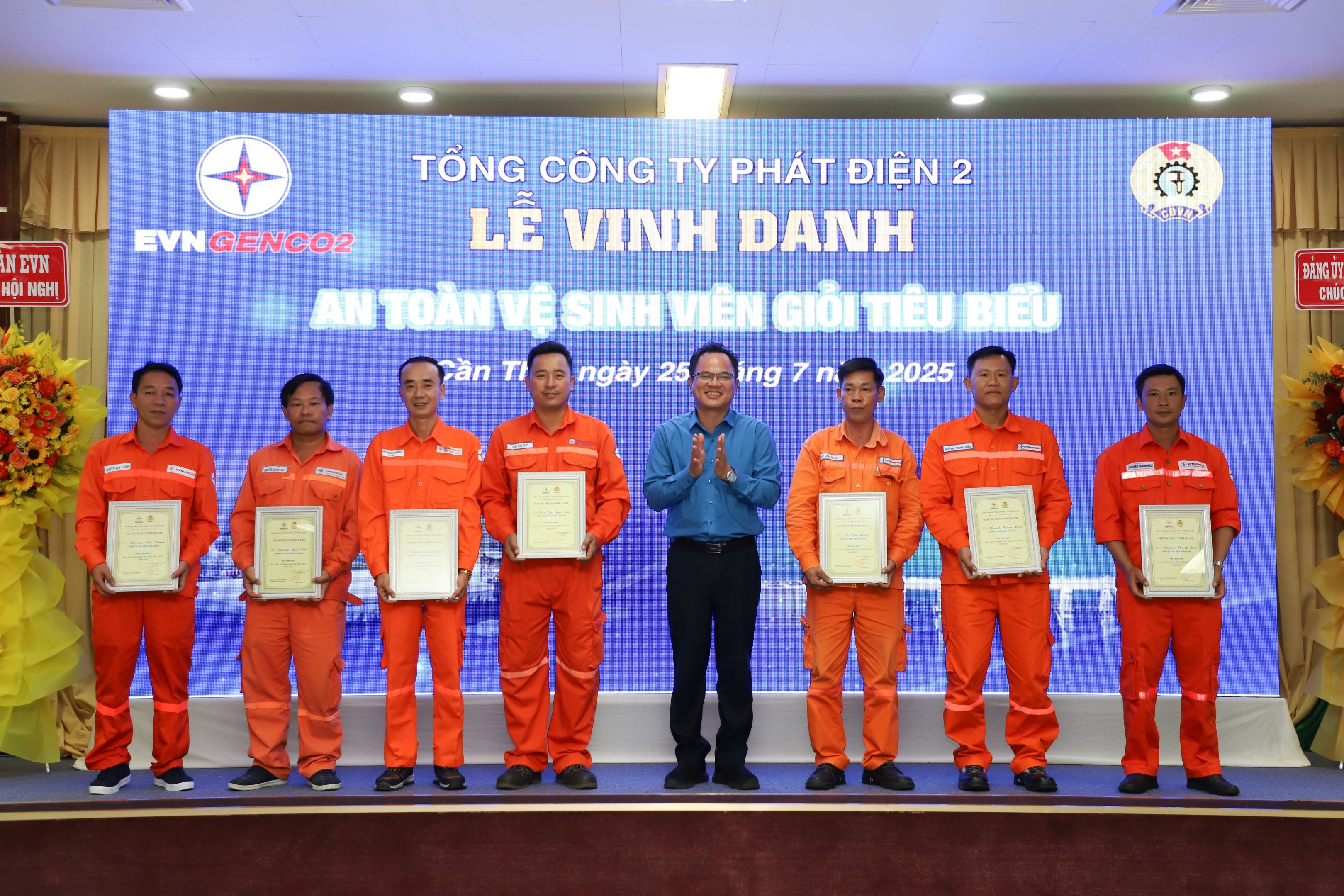 Ông Bùi Văn Thắng - Chủ tịch Công đoàn EVNGENCO2 (áo xanh) trao khen thưởng An toàn vệ sinh viên giỏi tiêu biểu năm 2025 cho ông Cao Bửu Quốc Duy (thứ 5 từ phải sang) (Ảnh: Minh Lương)