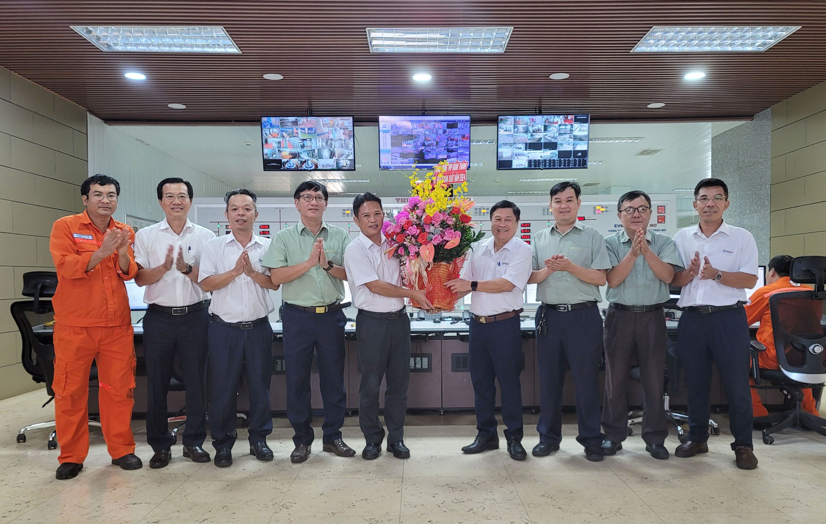 Tổng Giám đốc Nguyễn Văn Non (thứ tư bên phải sang)chúc mừng lực lượng sản xuất hoàn thành sớm sản lượng điện 2024