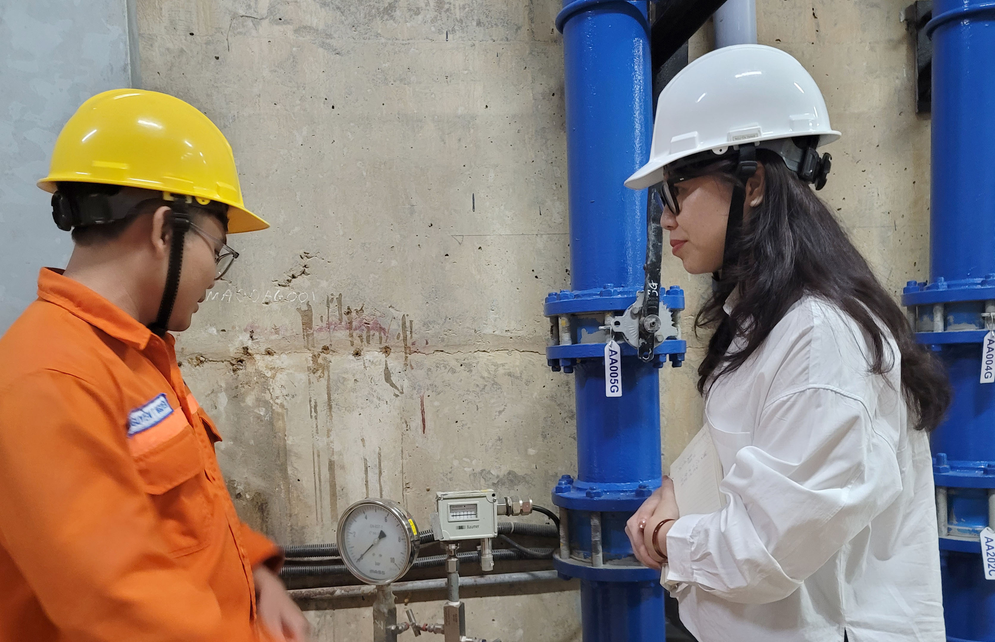 Chuyên viên Ban KHCNMT-EVN (áo trắng) làm rõ các thông tin, số liệu về thiết kế và vận hành thiết bị công nghệ xử lý môi trường