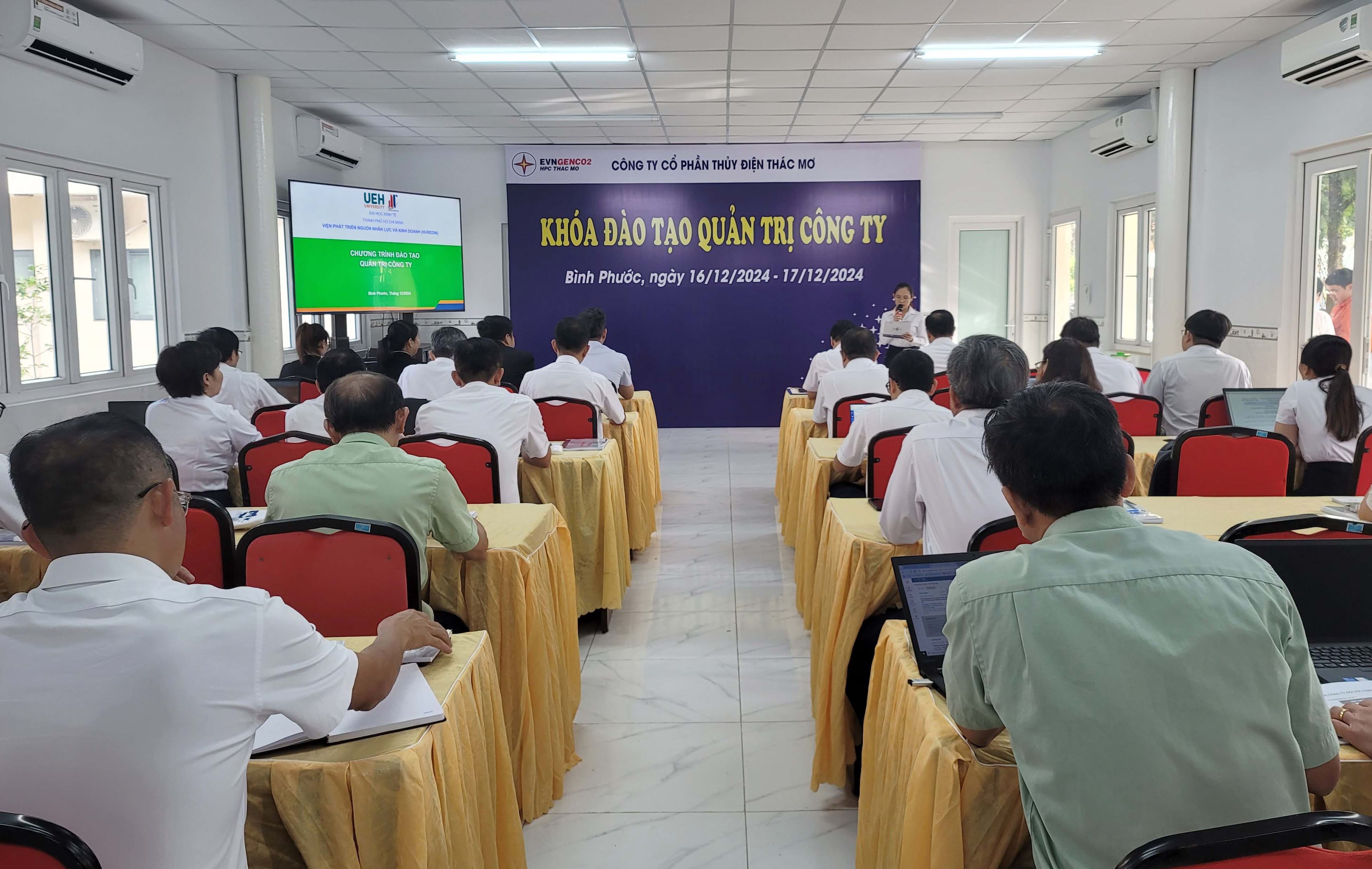 Thực hiện Nghị định số 155/2020/NĐ-CP ngày 31/12/2020 của Chính phủ quy định chi tiết thi hành một số Điều của Luật chứng khoán, trong đó có quy định về tổ chức đào tạo, tập huấn về quản trị công ty và các kỹ năng cần thiết cho thành viên Hội đồng quản trị, Tổng giám đốc và người quản lý khác của Công ty; thực hiện kế hoạch sản xuất kinh doanh năm 2024 TMP. Trong 2 ngày 16,17/12/2024, Công ty Cổ phần Thủy điện Thác Mơ (TMP) đã phối hợp Viện Phát triển Nguồn nhân lực và Kinh doanh – Đại học Kinh tế Thành phố Hồ Chí Minh, tổ chức “Khóa đào tạo Quản trị Công ty”, thành phần tham gia là Thành viên HĐQT, Ban Kiểm soát, Ban Tổng giám đốc, Trưởng/Phó Trưởng đơn vị và người công bố thông tin của TMP và 02 Công ty con. Nội dung khóa đào tạo cung cấp những kiến thức chuyên sâu về quản trị Công ty và những quy định nội bộ về Quản trị Công ty, chuẩn mực và thông lệ quốc tế cũng như các quy định pháp lý hiện hành về Quản trị Công ty tại Việt Nam mà còn trang bị các kỹ năng thực tiễn, giúp các học viên áp dụng hiệu quả vào công việc hàng ngày. Đặc biệt tại thời điểm các chính sách mới có liên quan đến Quản trị Công ty và thị trường chứng khoán bắt đầu có hiệu lực, đòi hỏi yêu cầu quảng trị công ty ngày càng cao. Khóa đào tạo kết hợp giữa lý thuyết với tọa đàm thực tiễn, học viên được chia sẻ, trao đổi và được giải đáp, làm rõ các vướng mắc về thực tiễn công tác Quản trị Công ty./.