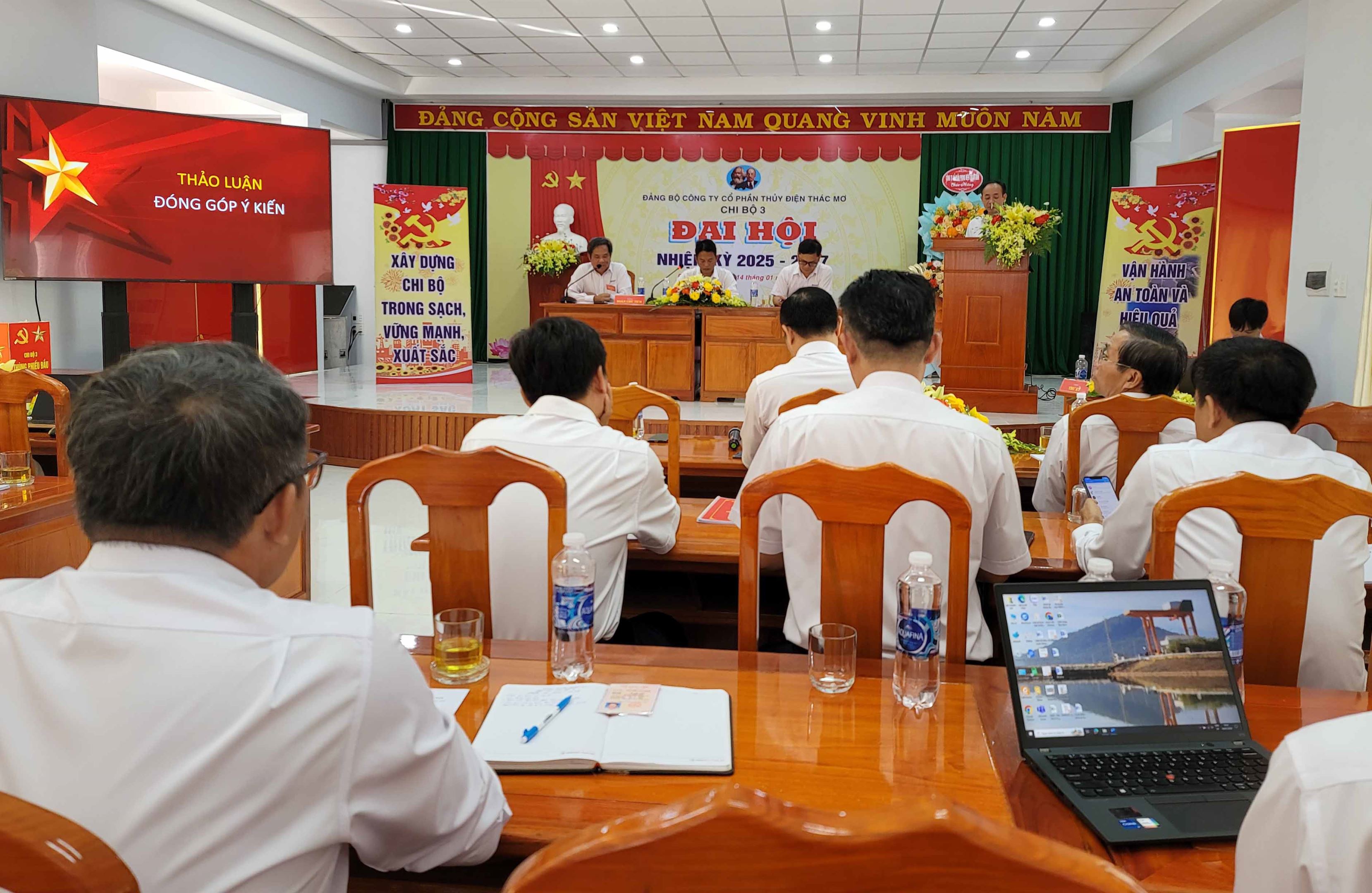 Hội nghị đã thống nhất bầu đoàn chủ tịch điều hành đại hội; thay mặt đoàn chủ tịch, đ/c Hồ Như Thiện Thọ - Phó Bí thư Chi bộ trình bày Báo cáo chính trị của chi bộ nhiệm kỳ 2022 – 2025 trình Đại hội nhiệm kỳ 2025-2027; đ/c Vũ Hữu Đàm Chi ủy viên trình bày Báo cáo kiểm điểm chi uỷ nhiệm kỳ 2022 – 2025 các đ/c Đảng viên Chi bộ 3 thực hiện đảm bảo theo chương trình hoạt động, nhiệm vụ SXKD của đơn vị. 100% cán bộ, đảng viên và người lao động được biết, học tập các chỉ thị, nghị quyết lớn của Đảng; 100% đảng viên chi bộ không vi phạm Điều lệ Đảng, quy định về những điều đảng viên không được làm. BCH Chi bộ 3 nhiệm kỳ 2022 – 2025 đánh giá tập thể lãnh đạo và tập thể người lao động không có biểu hiện suy thoái về tư tưởng chính trị, đạo đức, lối sống, “tự diễn biến”, “tự chuyển hóa”; nỗ lực học tập và làm theo tư tưởng, đạo đức, phong cách Hồ Chí Minh. Đề xuất Đảng bộ TMP biểu dương, khen thưởng kịp thời các gương điển hình thực hiện tốt việc học tập và làm theo tư tưởng, đạo đức, phong cách Hồ Chí Minh.