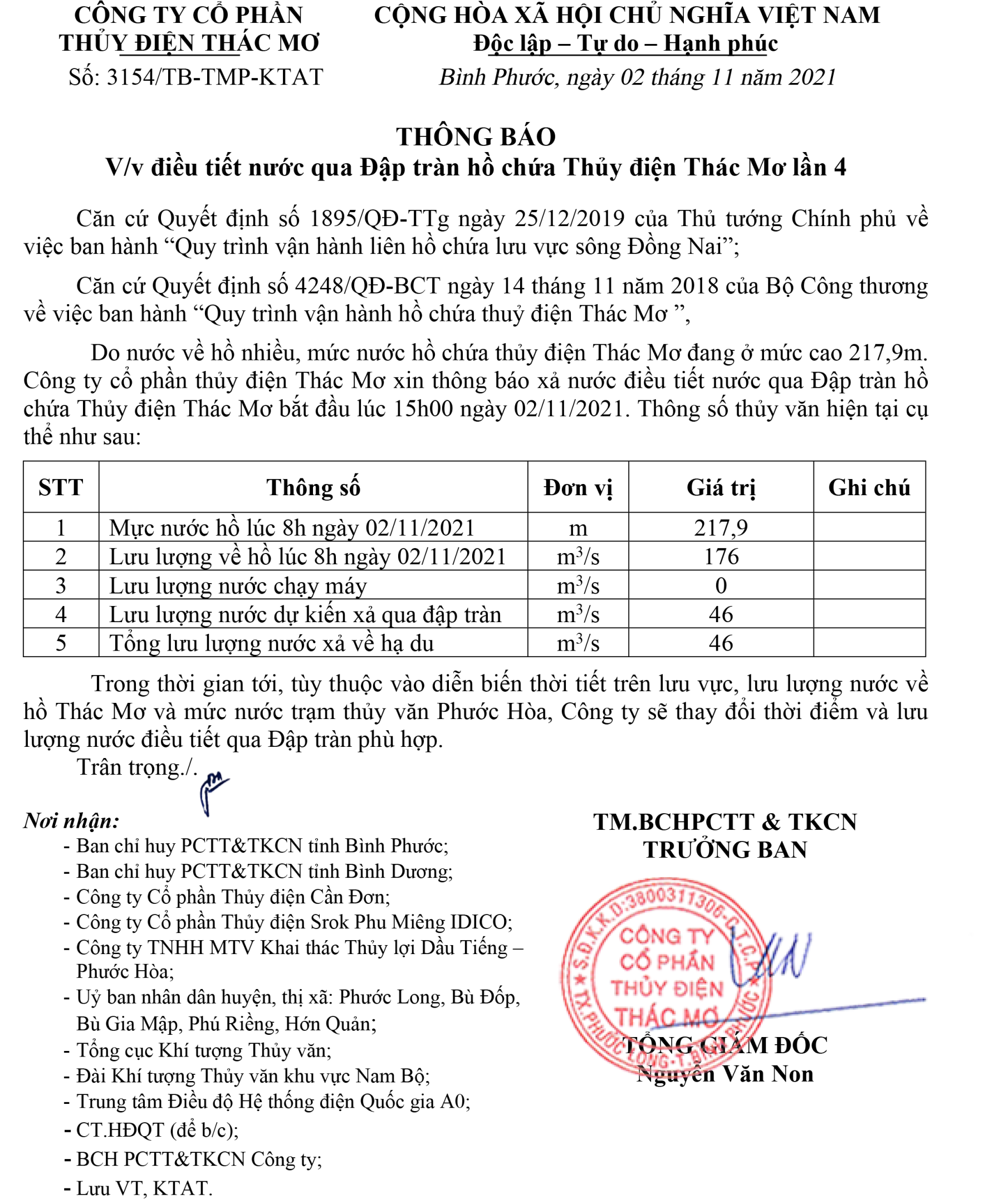 Thông báo điều tiết nước qua Đập tràn hồ chứa Thủy điện Thác Mơ lần 4