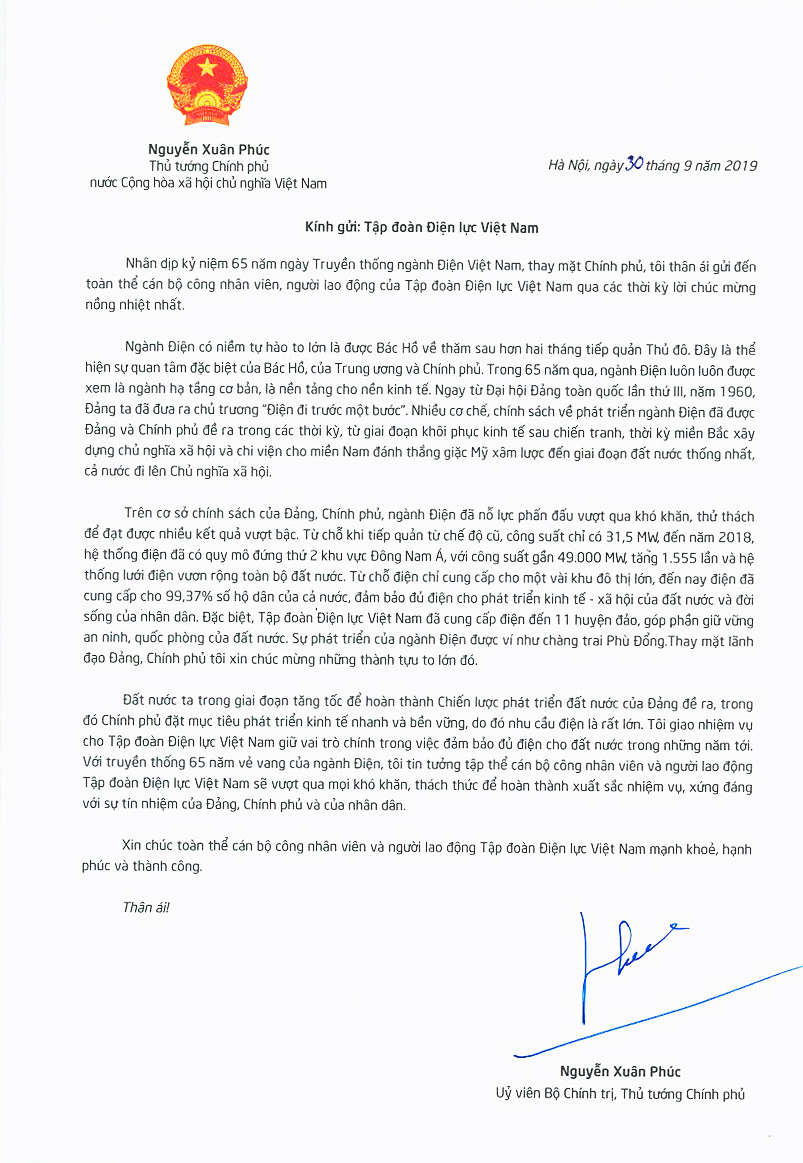 Nhân dịp kỷ niệm 65 năm ngày Truyền thống ngành Điện Việt Nam (21/12/1954 – 21/12/2019), thay mặt Chính phủ, Thủ tướng Nguyễn Xuân Phúc gửi thư chúc mừng đến toàn thể cán bộ công nhân viên, người lao động của Tập đoàn Điện lực Việt Nam.