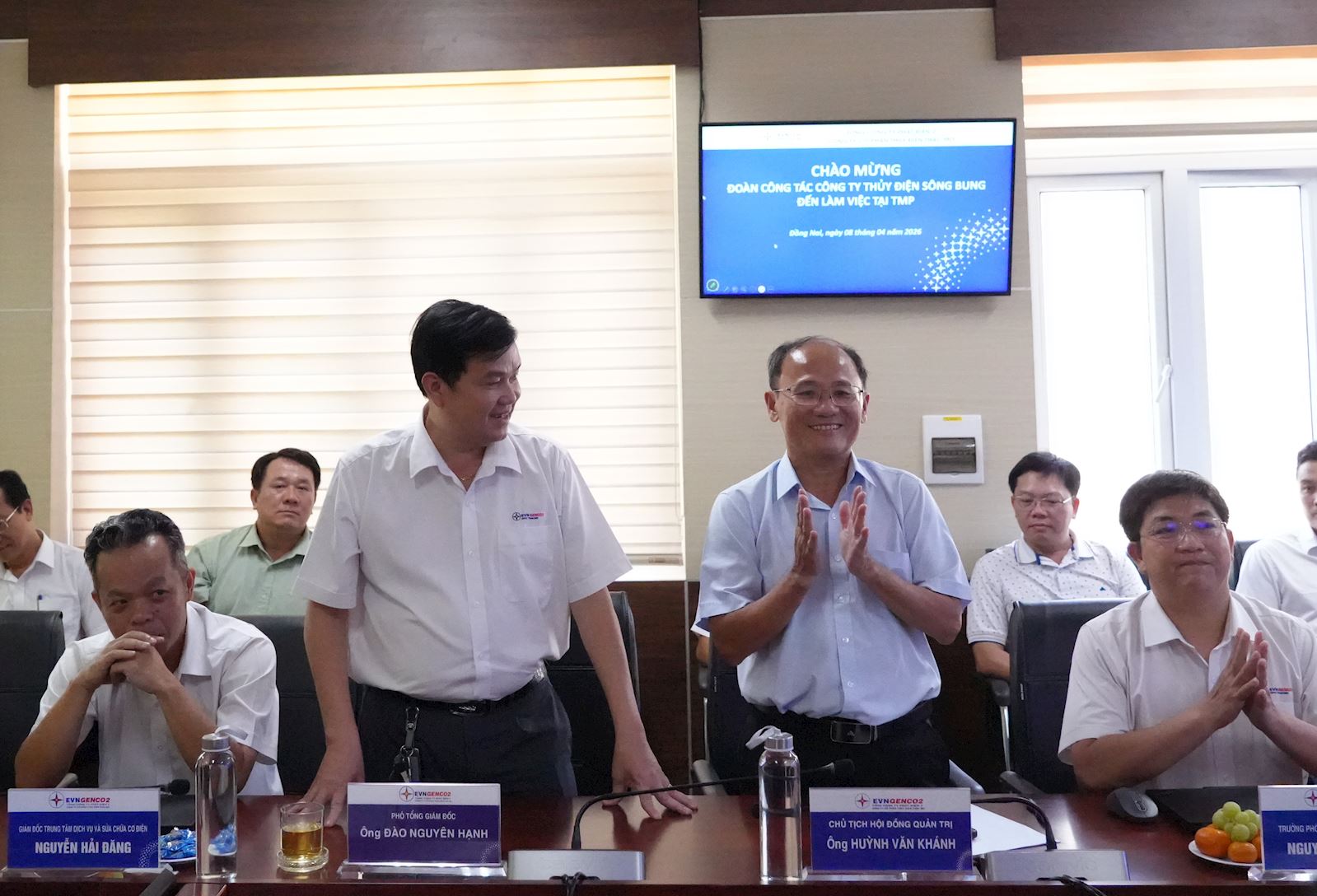 Ông Huỳnh Văn Khánh – Chủ tịch Công ty Cổ phần Thủy điện Thác Mơ (áo xanh, thứ hai từ trái sang, đang vỗ tay) cùng lãnh đạo Công ty tại buổi làm việc với Đoàn công tác.