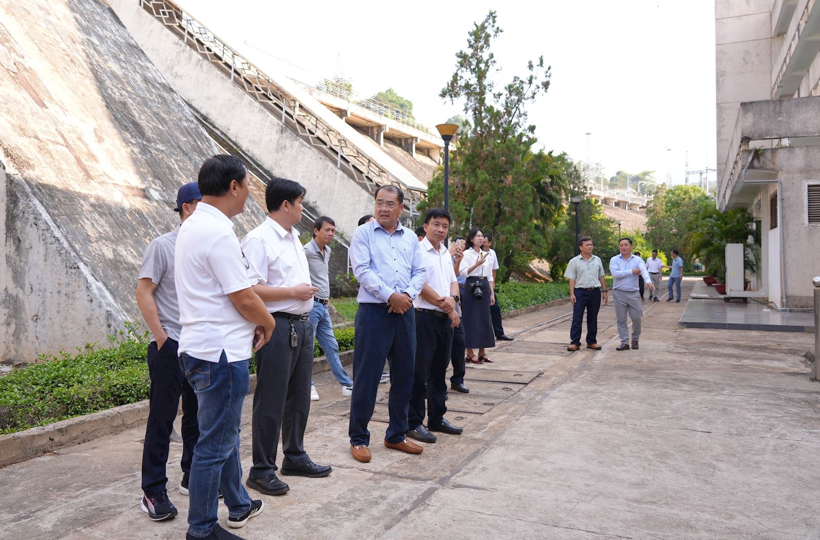 Đoàn công tác tại khu vực đập dâng Nhà máy Thủy điện Thác Mơ.