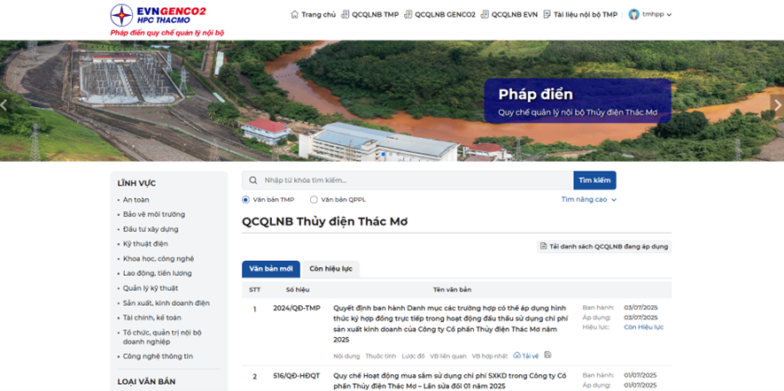 Trang pháp điển QCQLNB của TMP được phát triển trên nền tảng dữ liệu mở, cho phép liên kết đa tầng giữa các văn bản nội bộ của Công ty, văn bản của EVNGENCO2, EVN và các quy định pháp luật hiện hành. Người dùng có thể dễ dàng tra cứu, đối chiếu và truy xuất thông tin một cách nhanh chóng, chính xác và cập nhật tức thời, thay thế phương thức quản lý thủ công truyền thống. Hệ thống hoạt động như một “bản đồ quản trị số”, giúp thống nhất toàn bộ quy trình, quy chế và quy định trong Công ty, đảm bảo tính khoa học, nhất quán và thuận tiện trong việc áp dụng, điều hành.