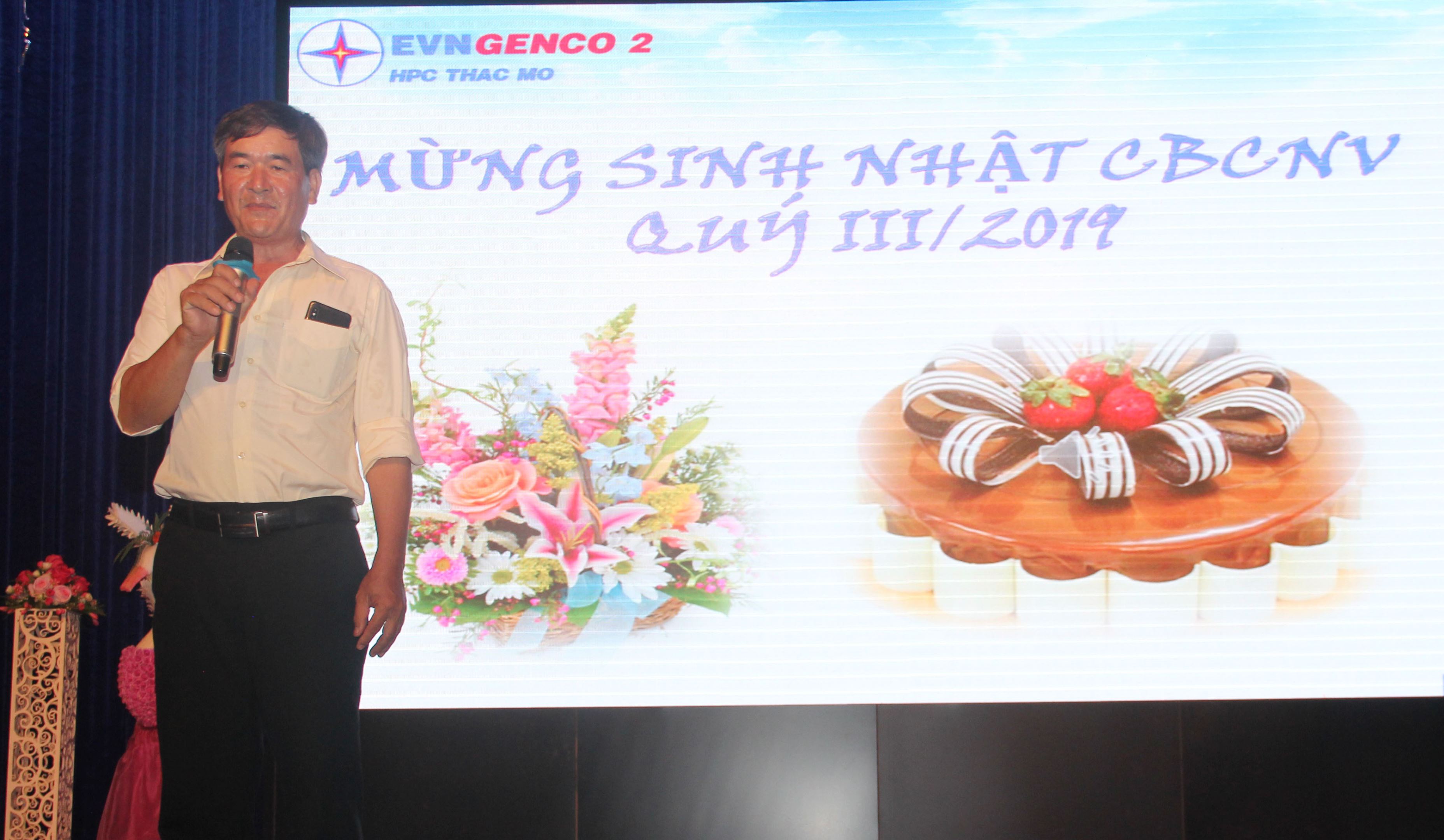 Trong không khí ấm cúng của buổi tiệc, ông Lê Minh Tuấn Tổng Giám đốc công ty, đại diện Ban lãnh đạo đã gửi đến toàn thể CBCNV sinh nhật quý III những lời chúc thật thân tình. Theo ông, kết thúc quý II, bước vào quý III công ty đã hoàn thành kế hoạch doanh thu. Bên cạnh đó, tình trạng thiết bị, công trình được vận hành an toàn tuyệt đối mặc dù thủy văn chưa chiều lòng người. những thành quả đó là nhờ sự tận tâm cống hiến của tập thể CBCNV công ty.