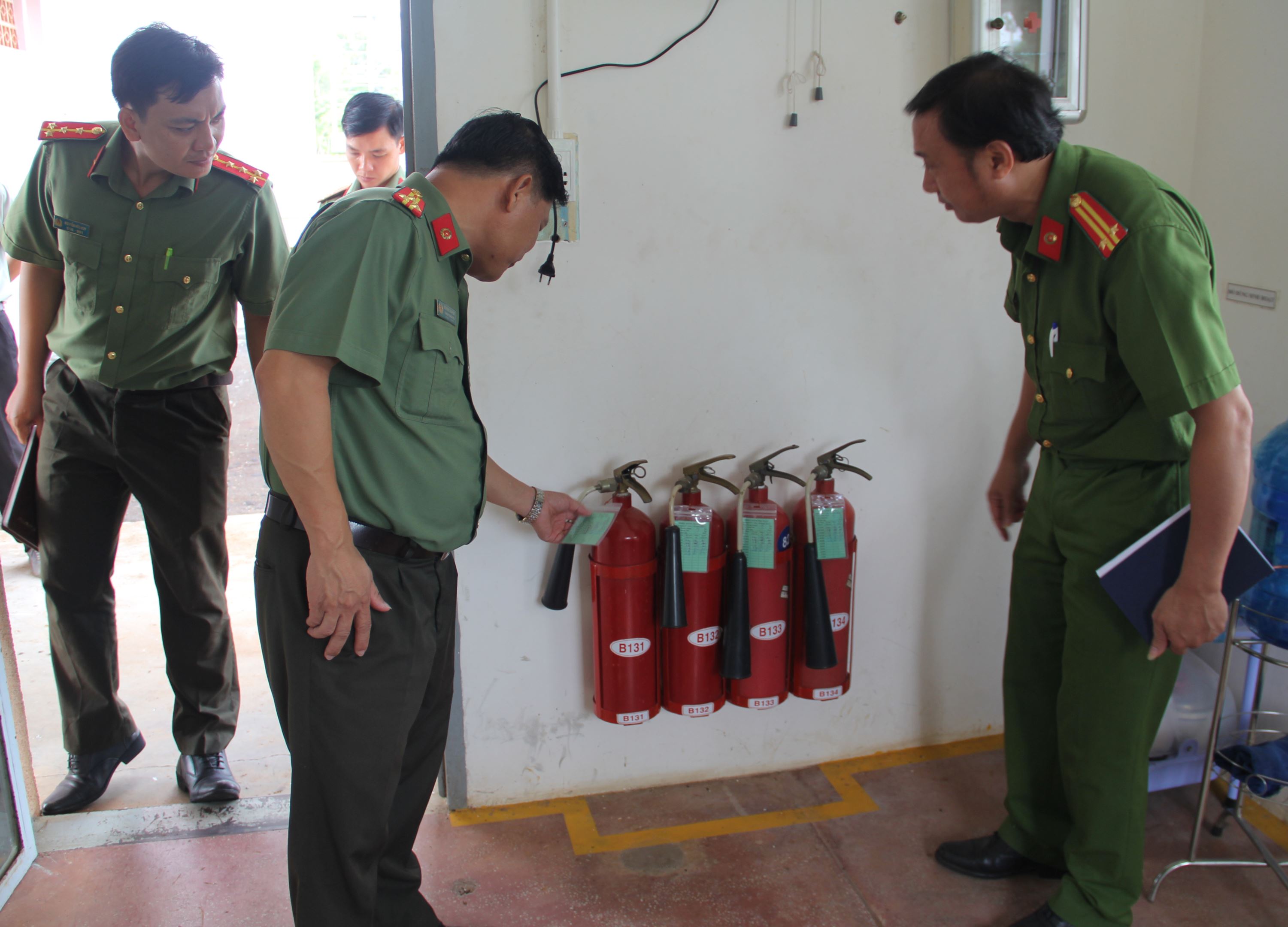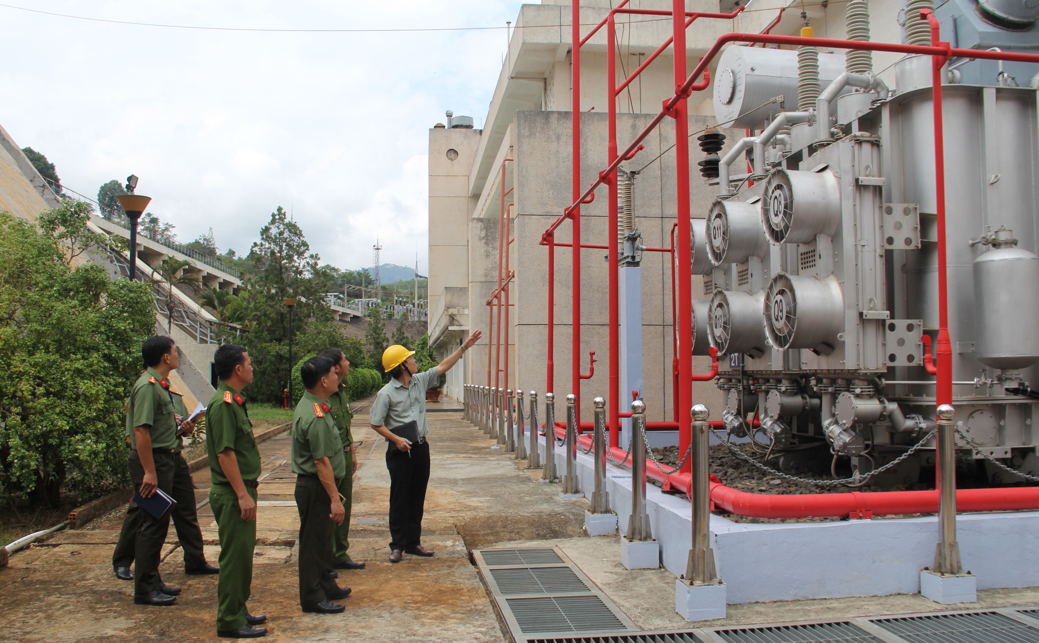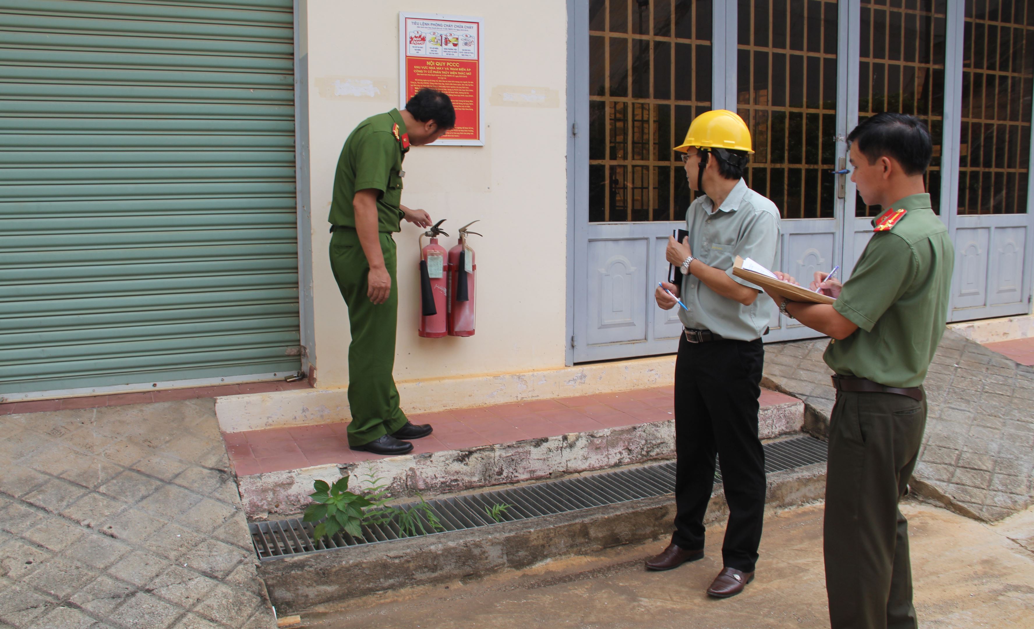 Đoàn kiểm tra thực tế tại hiện trường. Các loại bình chữa cháy được bố trí đầy đủ tại các cao trình kèm nội quy chữa cháy ở các vị trí thích hợp